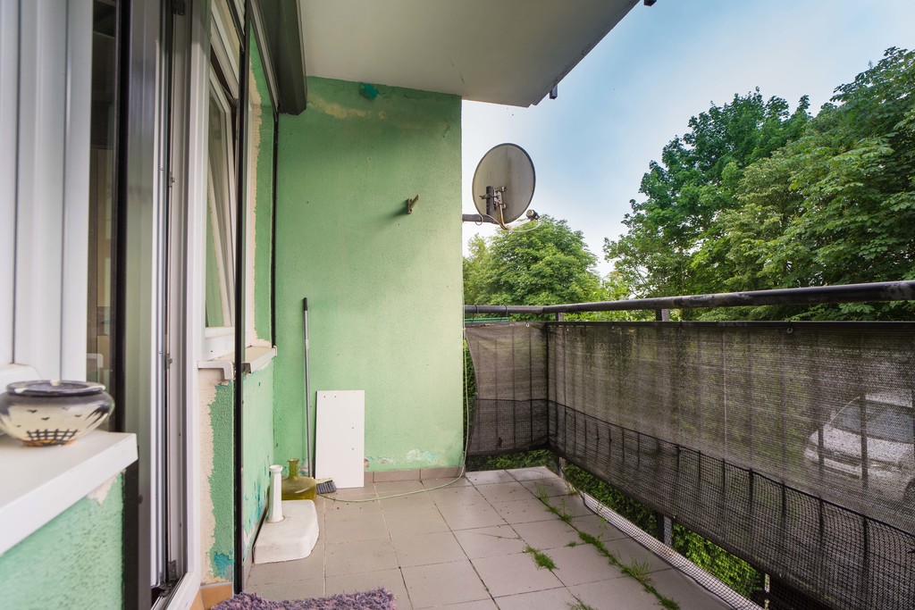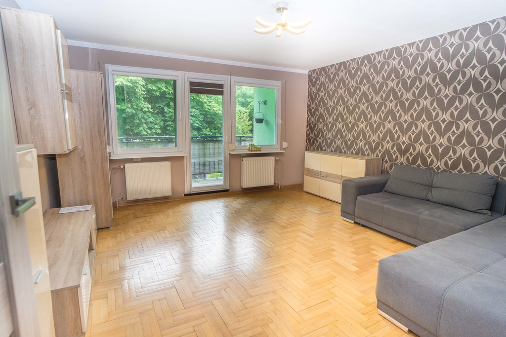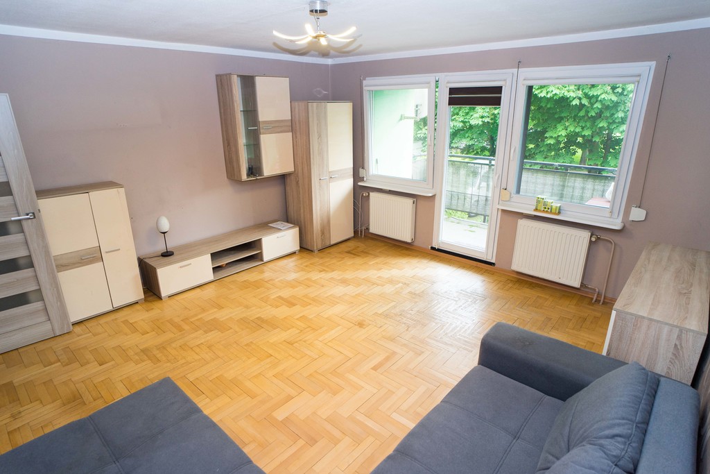 Mieszkanie mieści się na I piętrze niskiego bloku na spokojnym osiedlu wsród zieleni, z dużą ilością darmowych miejsc postojowych pod blokiem.