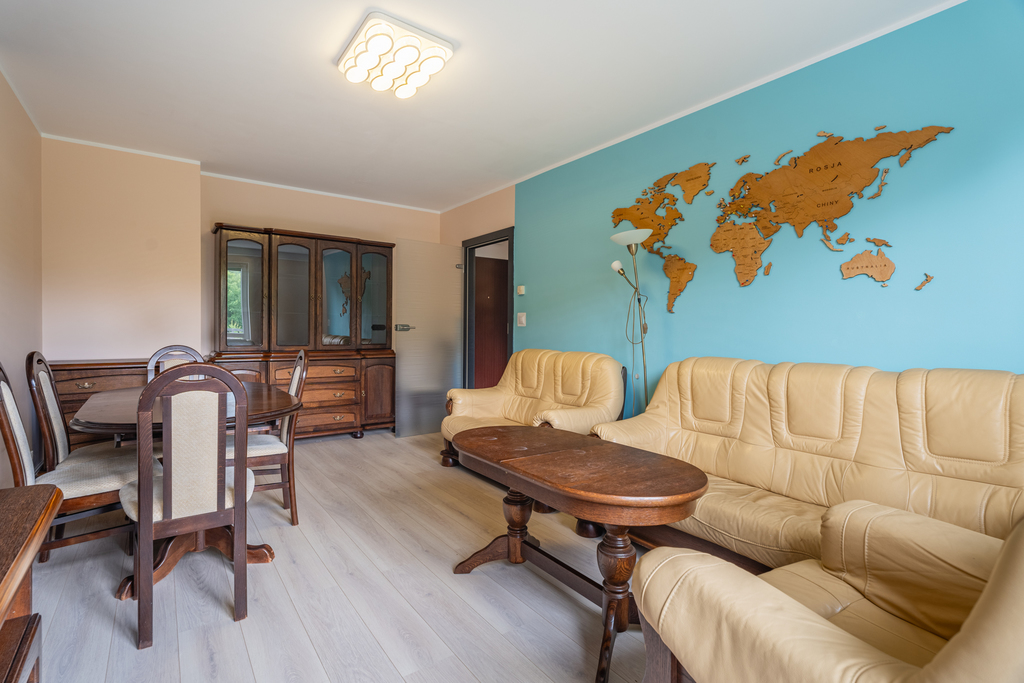 Salon (20 m2) wyposażony jest w sofę skórzaną, dwa fotele, dwa stoły, krzesła, obszerne komody i regały, szafę RTV, kino domowe, DVD, wyjście na balkon. W sypialni (11 m2): łóżko dwuosobowe z materacem, duża komoda, wielka garderoba, małe szafki, półka wisząca, TV Samsung, biurko z krzesłem. Kuchnia (9 m2) wyposażona we wszelkie niezbędne sprzęty: kuchenka elektryczna, piekarnik, okap, zmywarka, mikrofala, lodówko-zamrażarka, zlewozmywak, stół z miejscami do siedzenia, meble w zabudowie z dużą ilością miejsca do przechowywania rzeczy. W łazience (3 m2): kabina prysznicowa, WC, pralka, umywalka z szafką, szafki z lustrem i dużą ilością miejsca, duża szafa stojąca. W przedpokoju (6 m2) znajduje wielka garderoba w zabudowie. Drzwi antywłamaniowe. Na wyposażeniu mieszkania dodatkowo takie rzeczy jak: żelazko, odkurzacz, suszarka, ekspres do kawy, wyposażenie kuchni (naczynia, sztućce, garnki, patelnie, kubki, szklanki itp.).