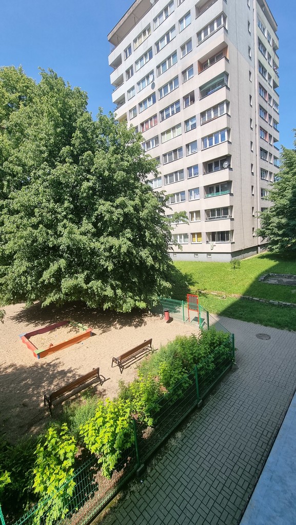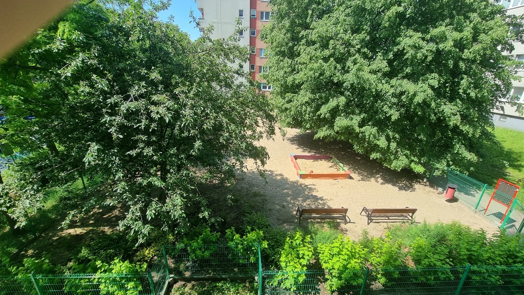 Dużo zieleni miejskiej, w pobliżu plac zabaw.