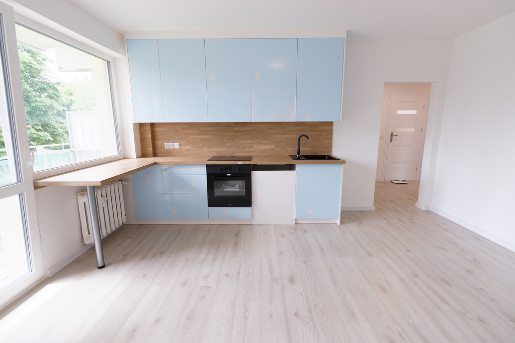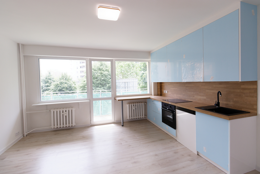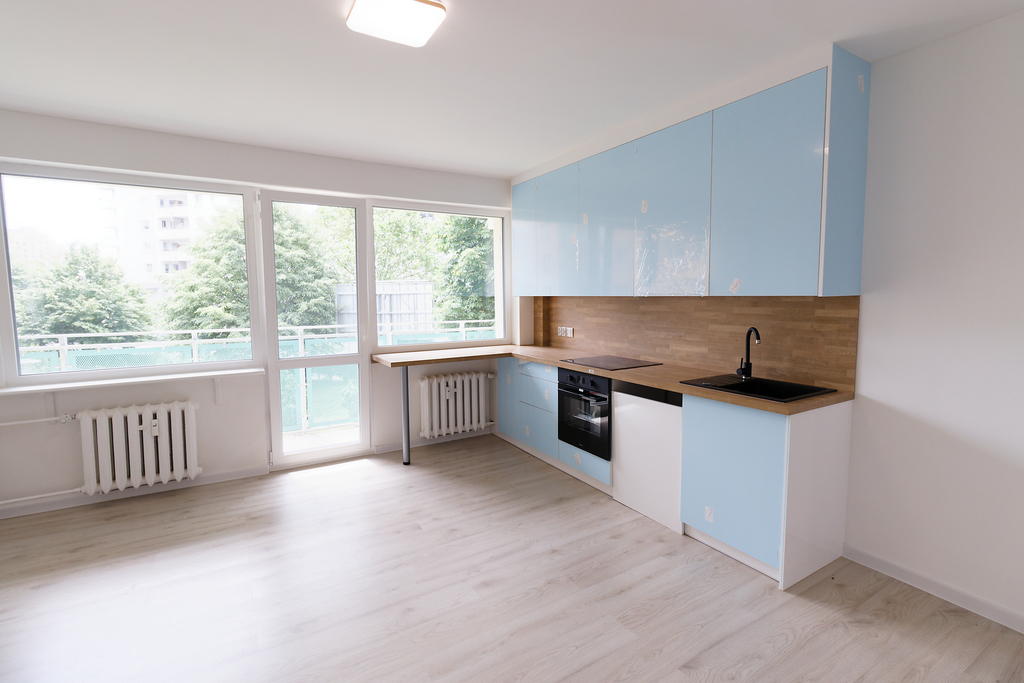 - Przestronny salon z aneksem kuchennym i wyjściem na balkon