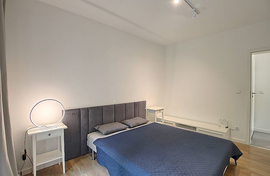 Obie sypialnie wyposażone w meble: w jednej jest podwójne łóżko, komoda i szafa, w drugiej kanapa narożna.