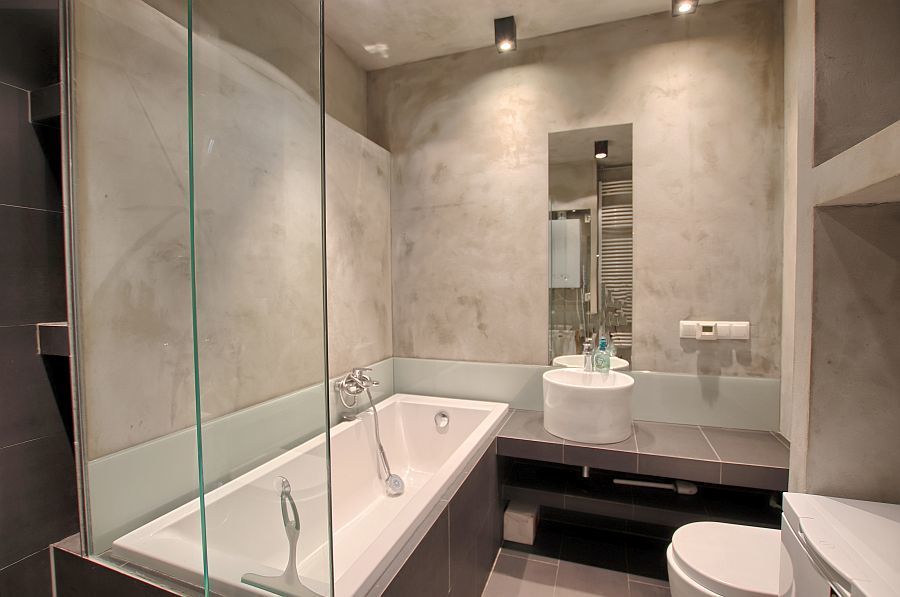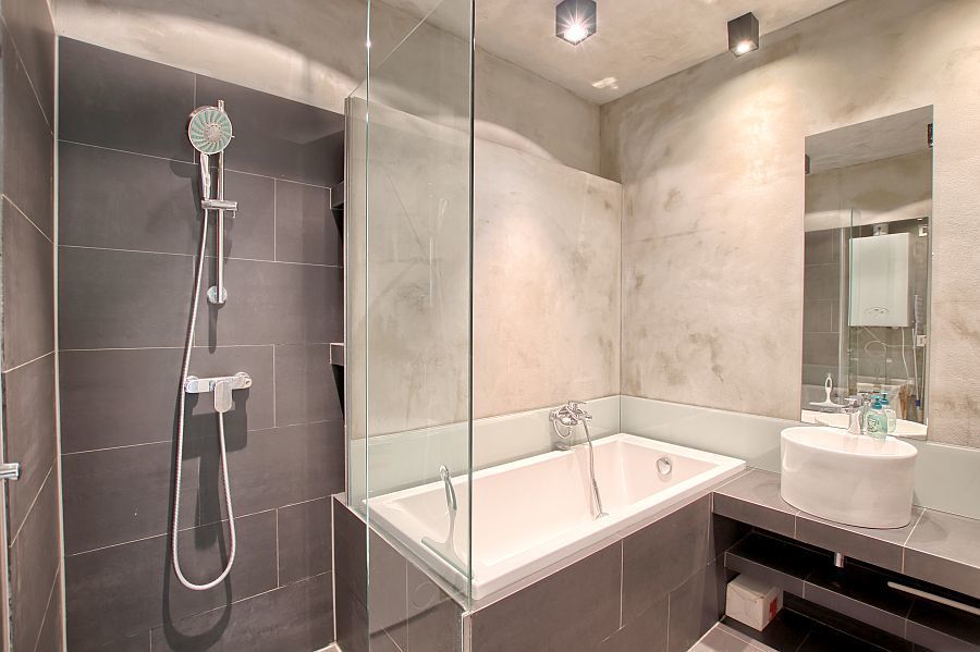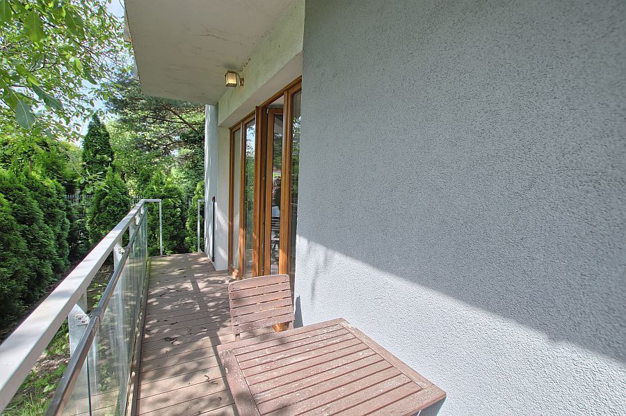 W łazience jest wanna oraz kabina prysznicowa. Jest pralka. Z salonu wyjście na taras.