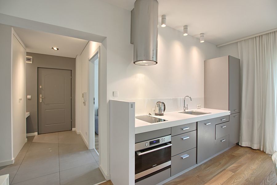 Kuchnia umeblowana i wyposażona w sprzęt AGD- płytę grzejną, lodówkę z zamrażarką, okap, zmywarkę, piekarnik.