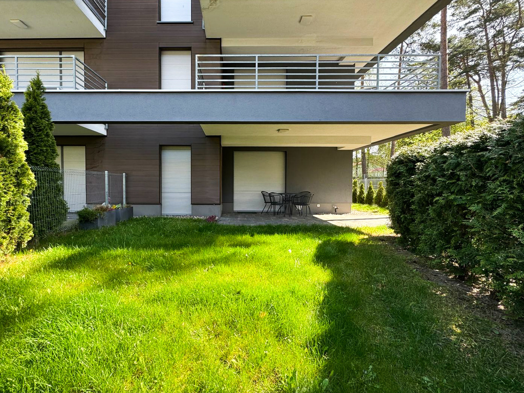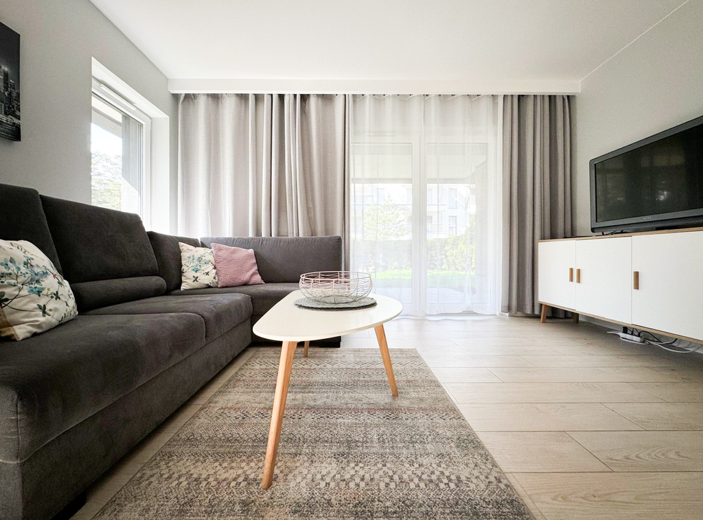 Apartament urządzony w nowoczesnym stylu zlokalizowany na parterze budynku z tarasem, ogródkiem i miejscem parkingowym.