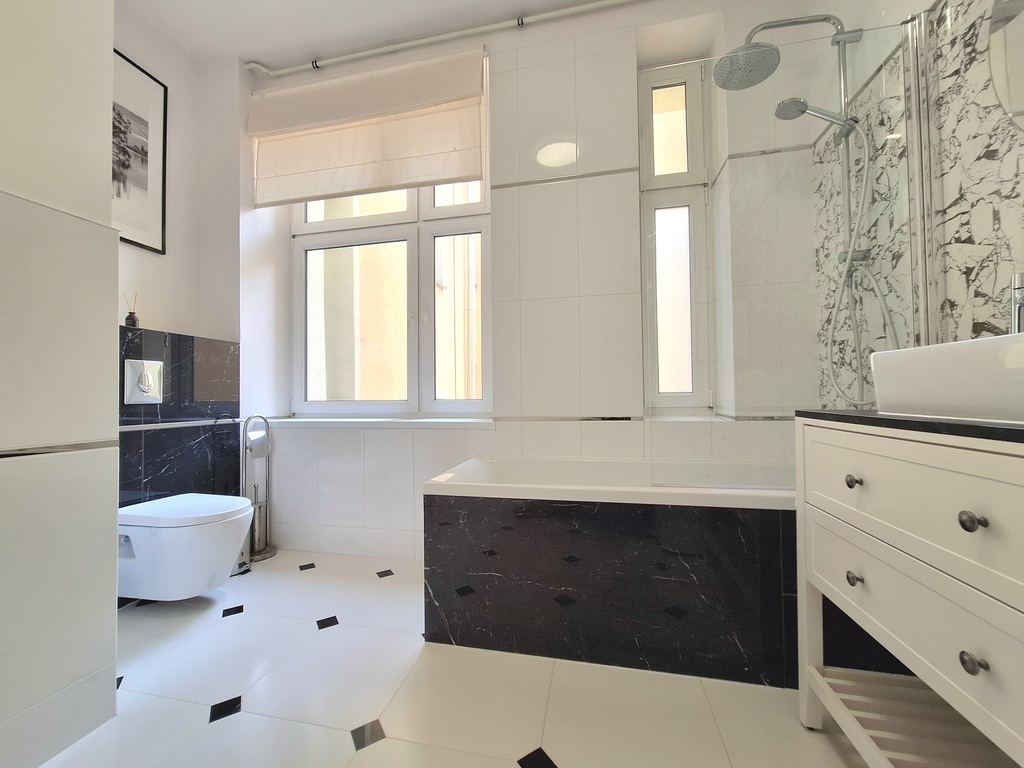 - duża łazienka z dwoma oknami, wykończona stylowymi płytkami i gresem,