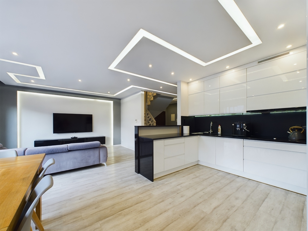 Na pierwszym poziomie znajduje się przestronny salon połączony z kuchnią oraz łazienkę. Salon jest jasny i przestronny, z dużymi oknami wychodzącymi na północ, co zapewnia piękny widok na okolicę. Kuchnia jest w pełni wyposażona w sprzęt AGD i ma wystarczająco miejsca do przygotowywania posiłków.