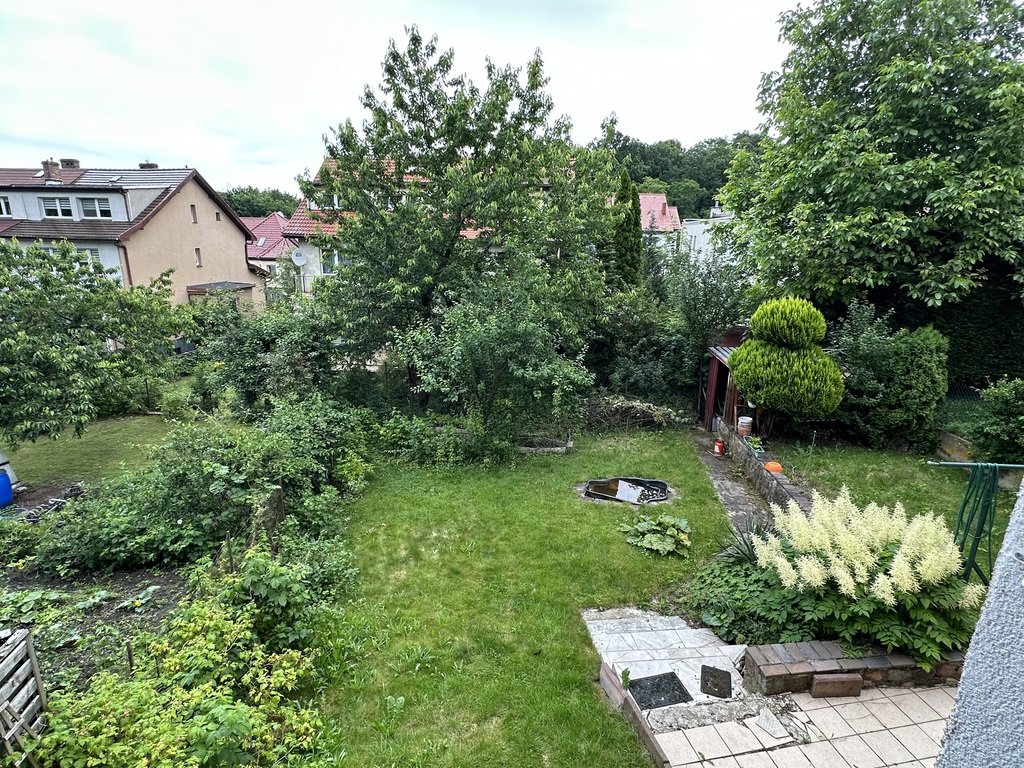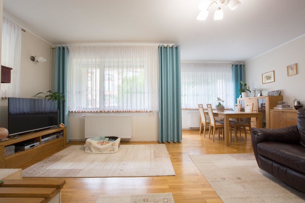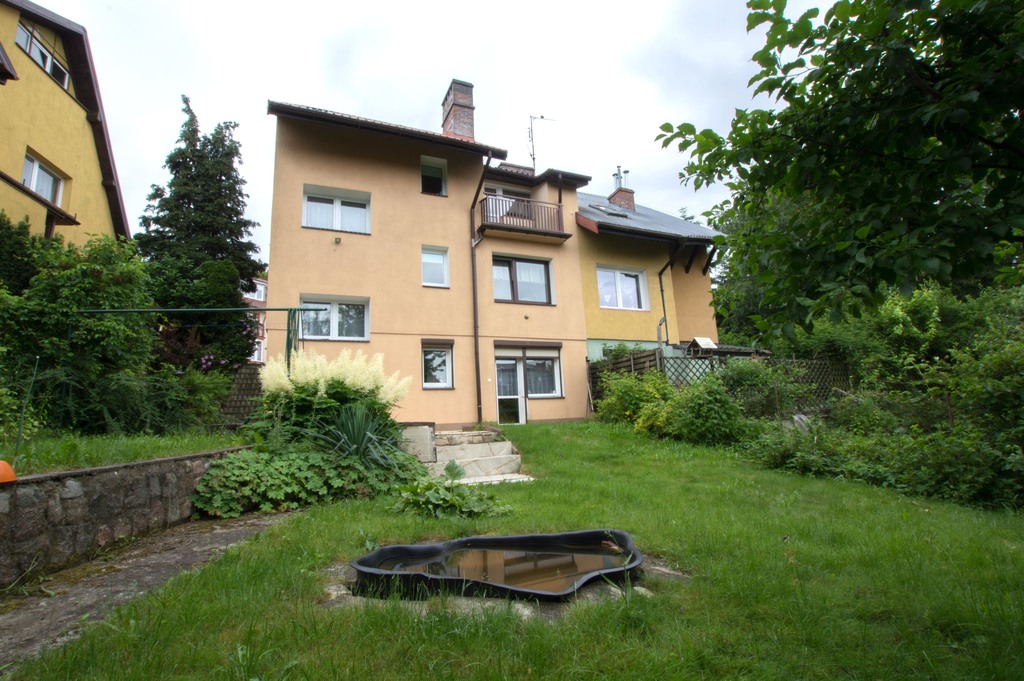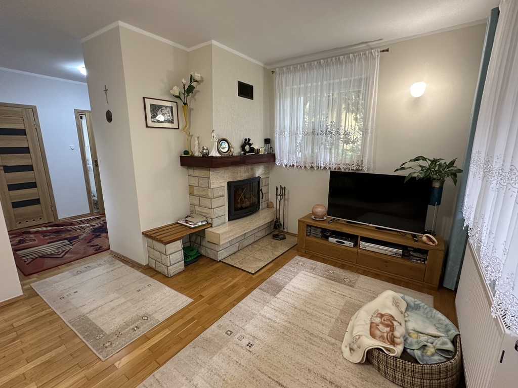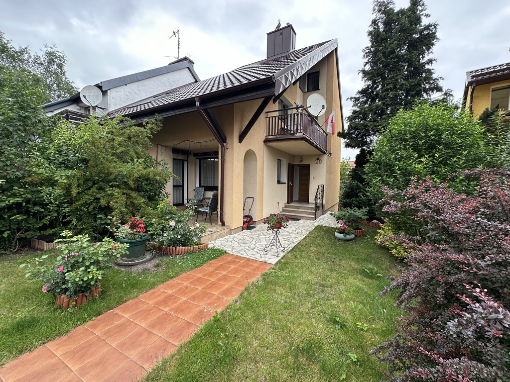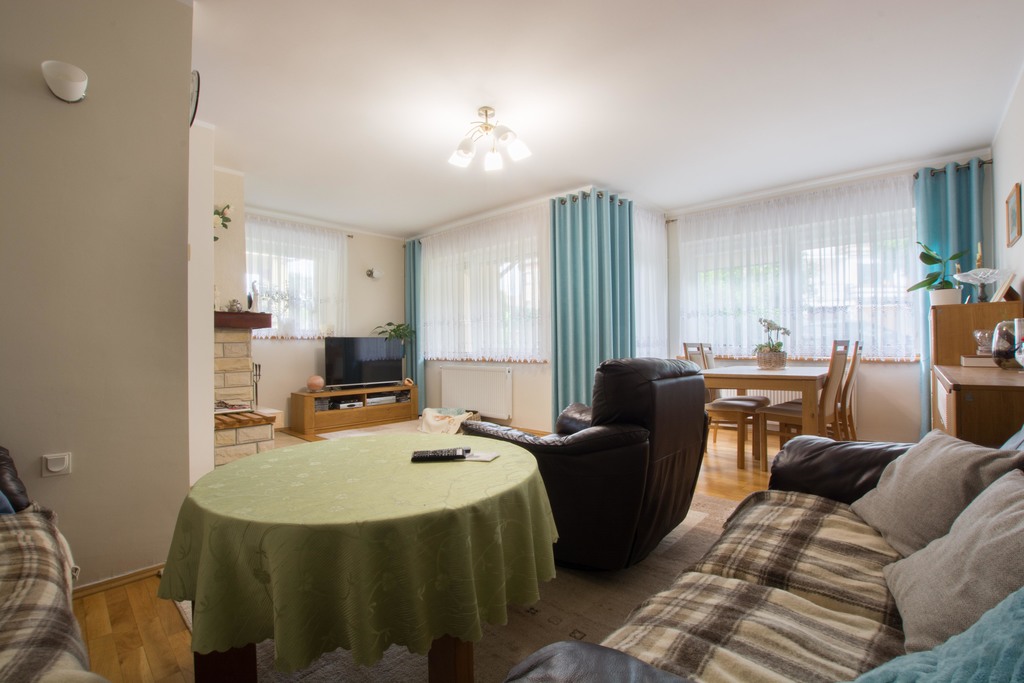 Na parterze znajduje się salon z kominkiem, z niego wyjście na zadbany ogród z licznymi nasadzeniami.