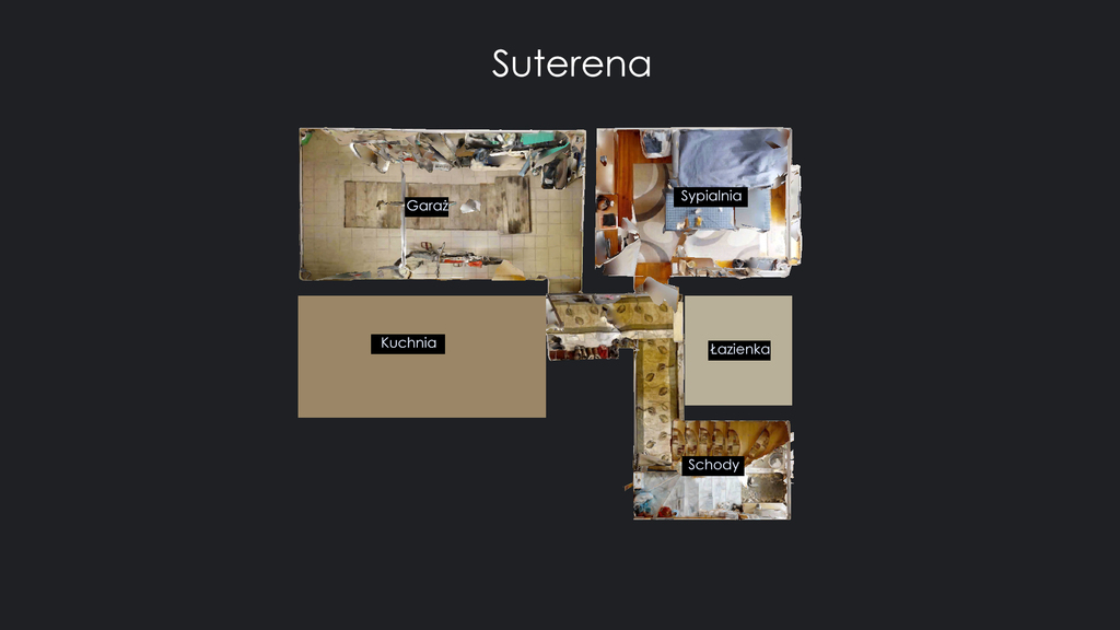 Poziom -1 - suterena: garaż, kuchnia, sypialnia, łazienka, schody,