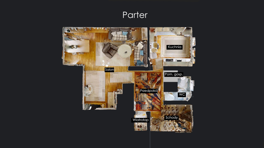 Parter: na zewnątrz: wiatrołap, ganek, w środku: przedpokój, salon, kuchnia, pomieszczenie gospodarcze, komunikacja - schody, wc,