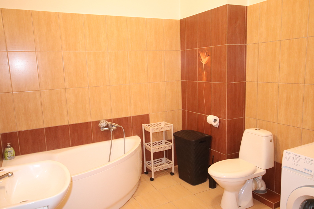 W łazience wanna i pralka, duży korytarz.
