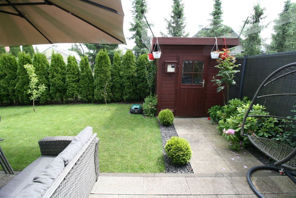 Ogród zagospodarowany z licznymi nasadzeniami. Rozprowadzony system samopodlewający i kosiarka samokosząca. W ogrodzie znajduje się także pomieszczenie - sauna. Przed wejściem do domu miejsce postojowe, garaż z bramą na pilota i wiata garażowa.