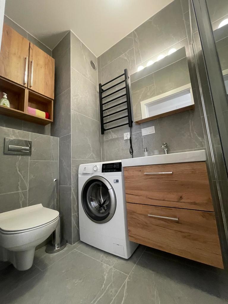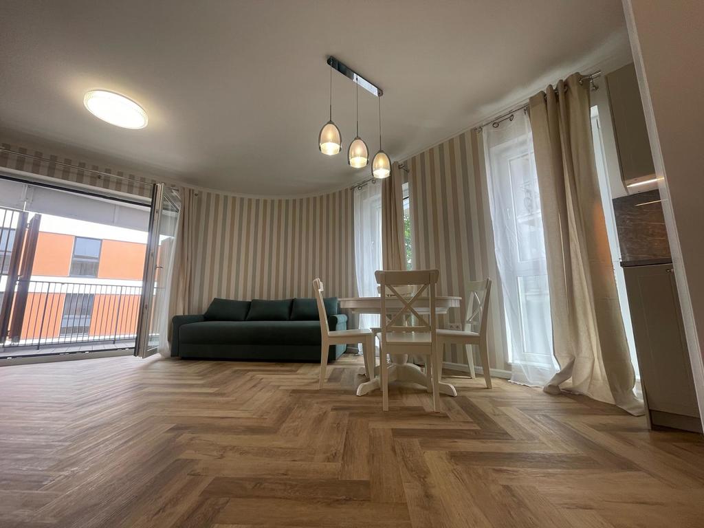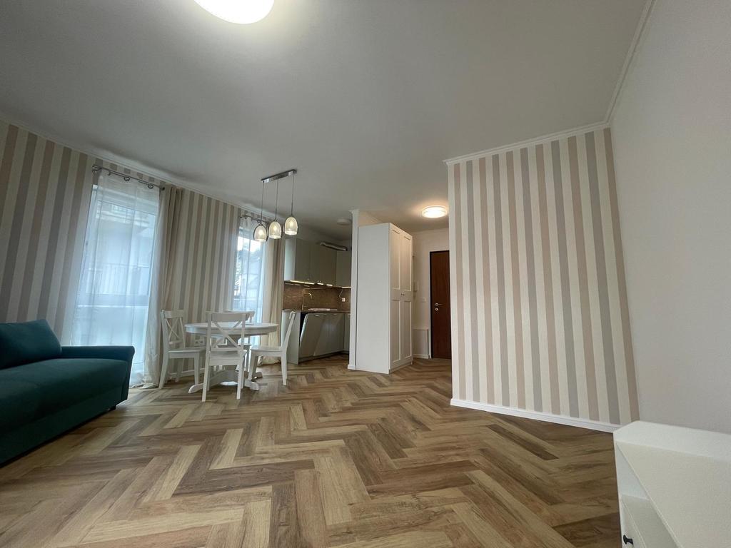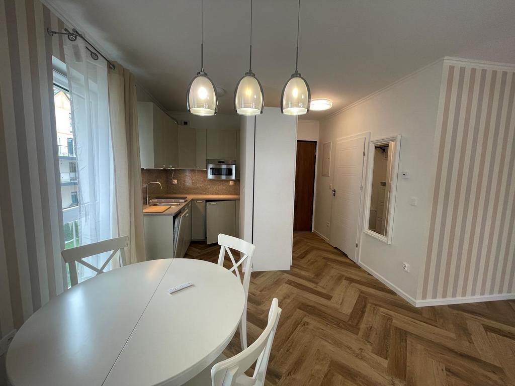 Jest tam cisza i spokój, gdyż apartament znajduje się w środkowej linii zabudowy całego kompleksu. Atutem jest również miejsce postojowe w garażu podziemnym. Apartamentowiec z wieloma udogodnieniami, w tym: recepcja z całodobową obsługą, strefa basenów ( zewnętrzny i wewnętrzny), jacuzzi, sauny, sala zabaw dla dzieci, zewnętrzny plac zabaw dla dzieci, restauracja, siłownia i cichobieżne windy. Jest wykończony w wysokim standardzie. Składa się: z łazienki (która wyposażona jest w kabinę prysznicową, wc, szafka z umywalką i pralką) oraz salonu z aneksem kuchennym (meble w kolorze kaszmirowym ze sprzętem AGD, w którego skład wchodzą: lodówka, zmywarka, okap. płyta grzewcza, garnki, talerze, noże). W salonie znajduje się stół rozkładany z krzesłami, rozkładana sofa, komoda i istnieje również możliwość postawienia dodatkowego łóżka.W przedpokoju jest szafa ubraniowa i szafka na buty. Czynsz jeszcze nie został ustalony. Serdecznie zapraszam na prezentację nieruchomości w topowej lokalizacji.