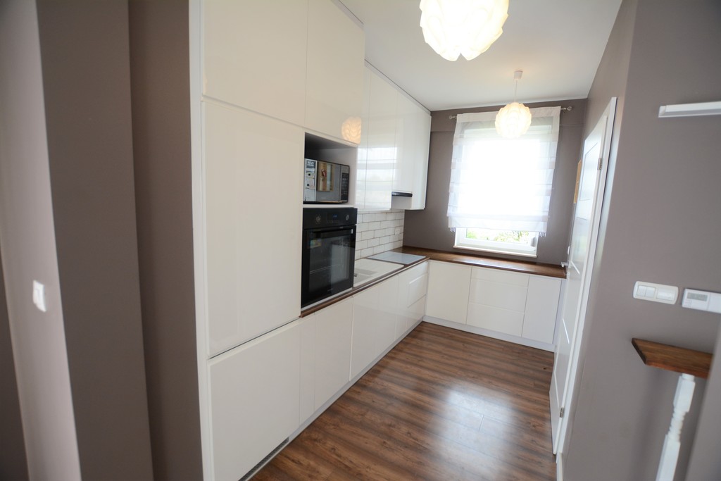 - Kuchnia meble lakierowane w stałej zabudowie. Na wyposażeniu sprzęt AGD: ( piekarnik elektryczny, płyta indukcyjna, zmywarka, lodówka z zamrażalnikiem, okap) .