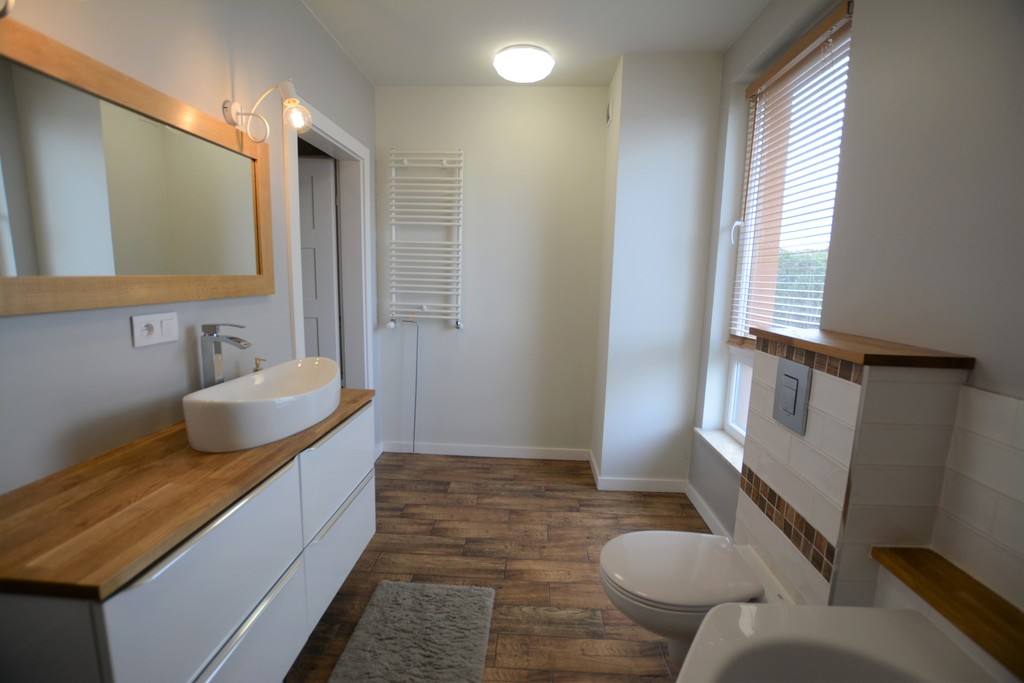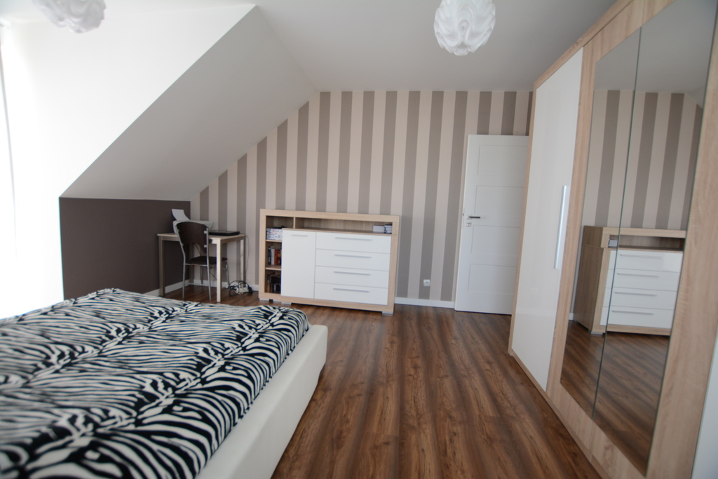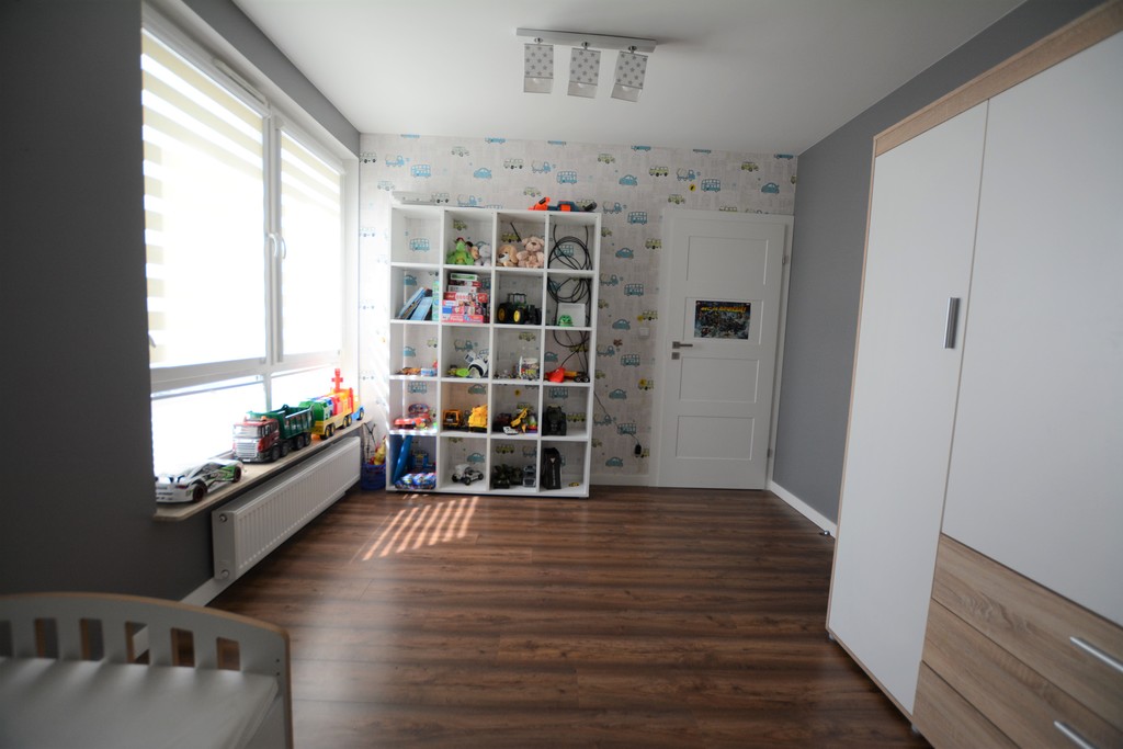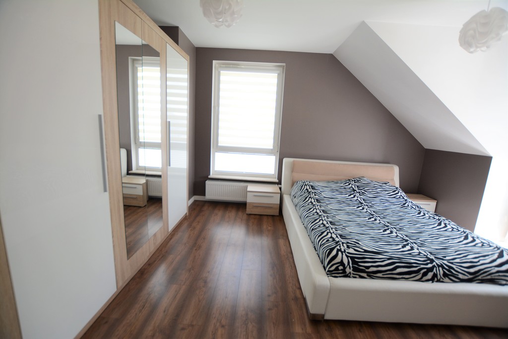 - Ściany gładzone malowane, na podłogach panele podłogowe.
