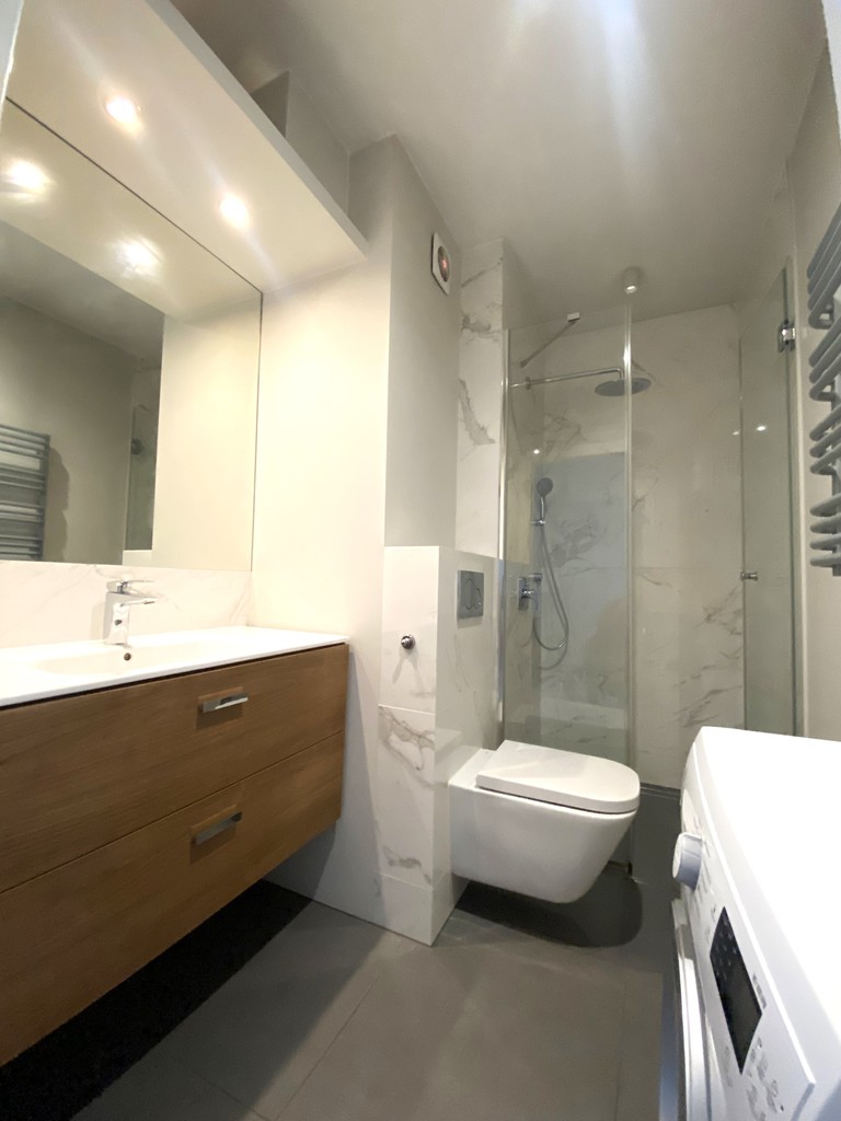 *łazienka z WC, kabina prysznicowa, pralka automatyczna