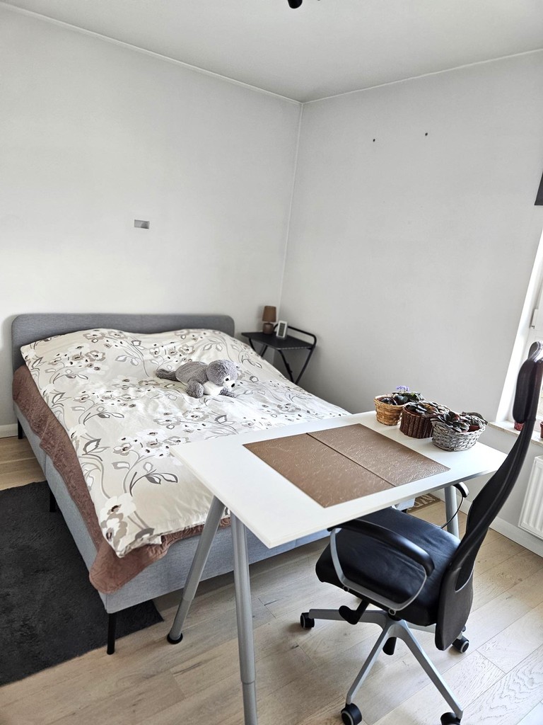 *funkcjonalna sypialnia wyposażona w duże łóżko, szafę i biurko
