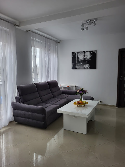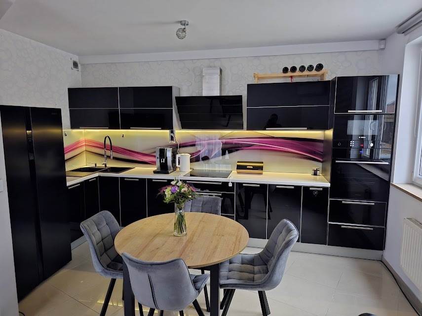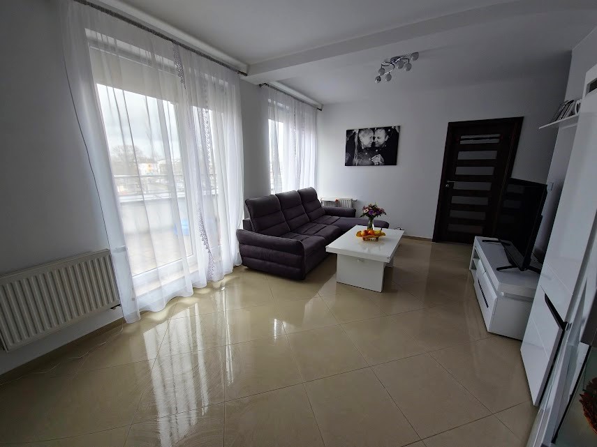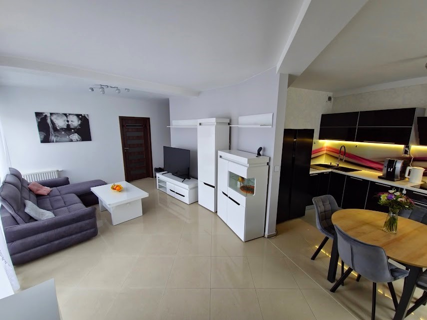 - Jasny przestronny salon z aneksem kuchennym z którego przedostać możemy się również na taras,
