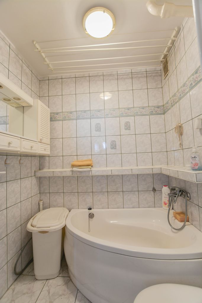 Kuchnia z oknem w glazurze i terakocie stanowi osobne pomieszczenie. Łazienka również w kaflach z wanną i wc.