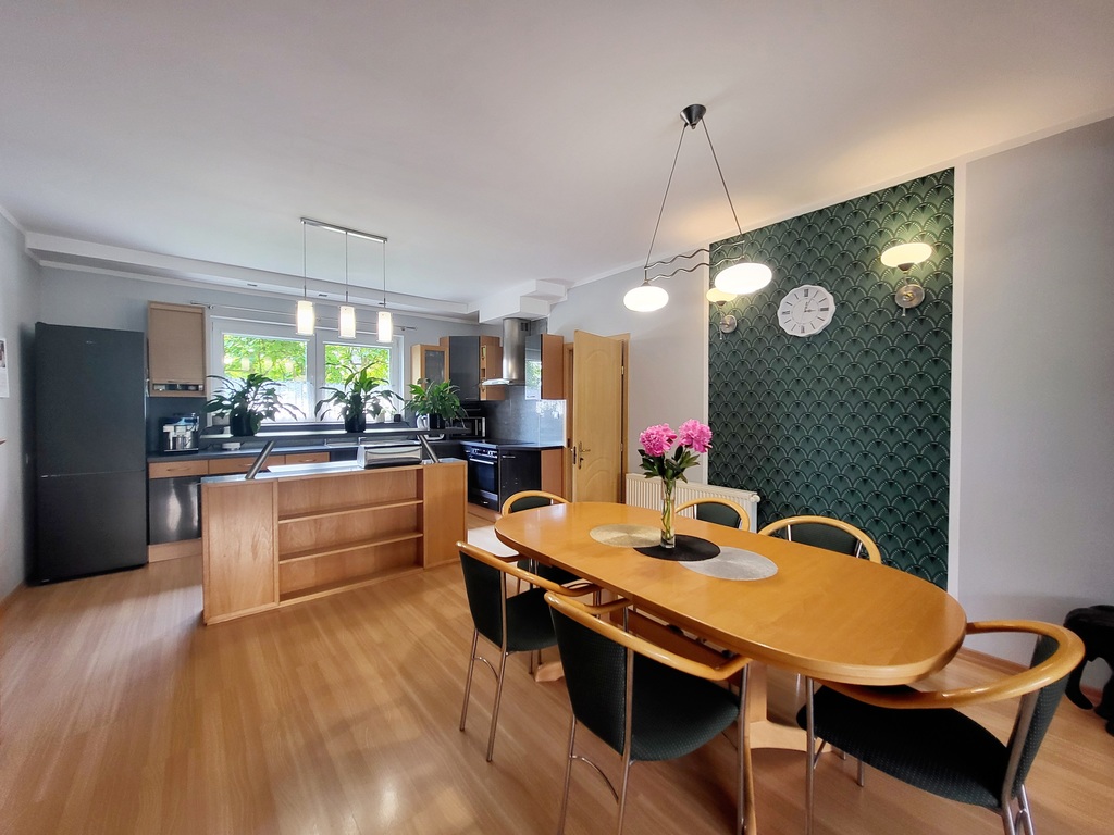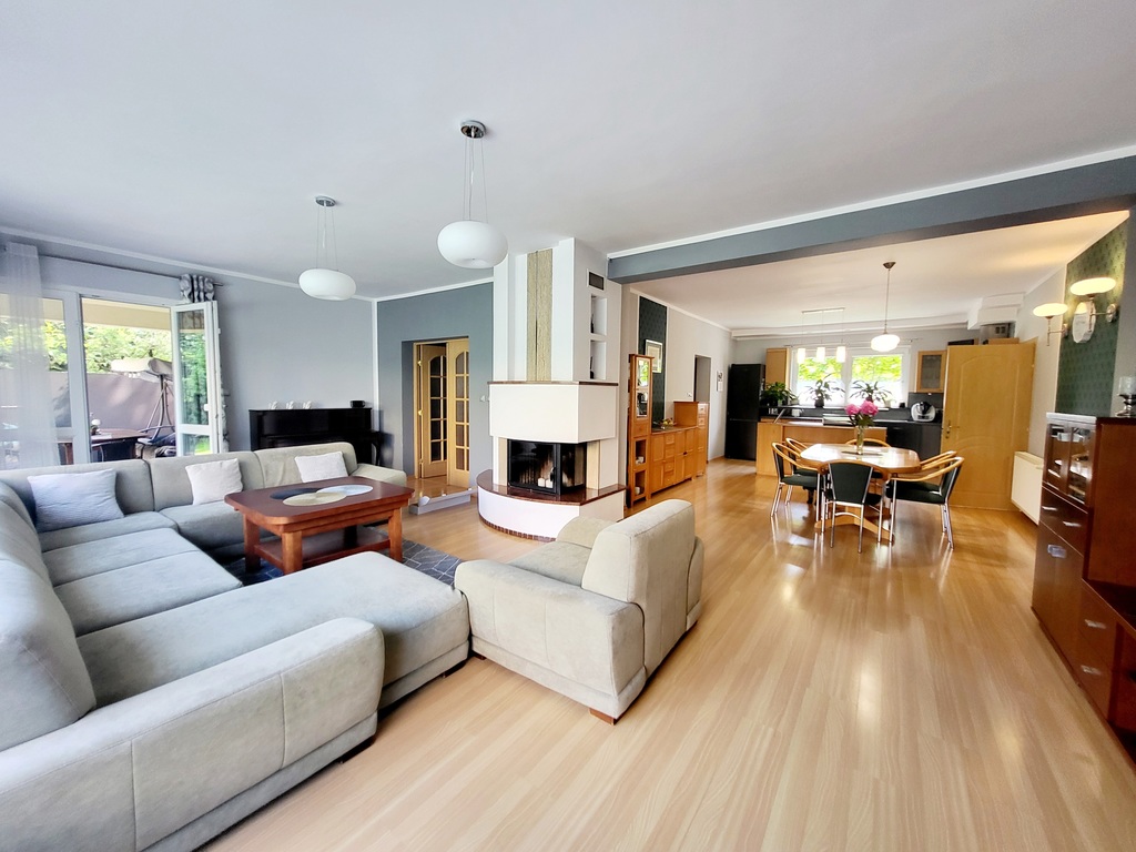 Niezmiernymi atutami nieruchomości są wysokie sufity, otwarte przestrzenie oraz duże okna dzięki, którym do środka wpada mnóstwo światła dziennego. Udogodnienia w postaci pomieszczenia gospodarczego, strychu, schowka oraz drewnianego domku na narzędzia ogrodowe z drewutnią są dodatkowymi miejscami na przechowywanie i zwiększają funkcjonalność domu. Zainstalowana fotowoltaika produkuje więcej energii niż bieżące zapotrzebowanie.