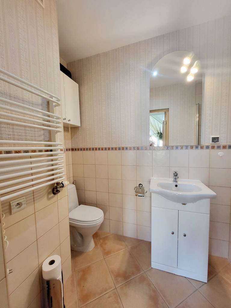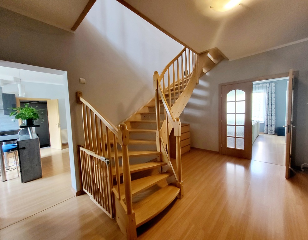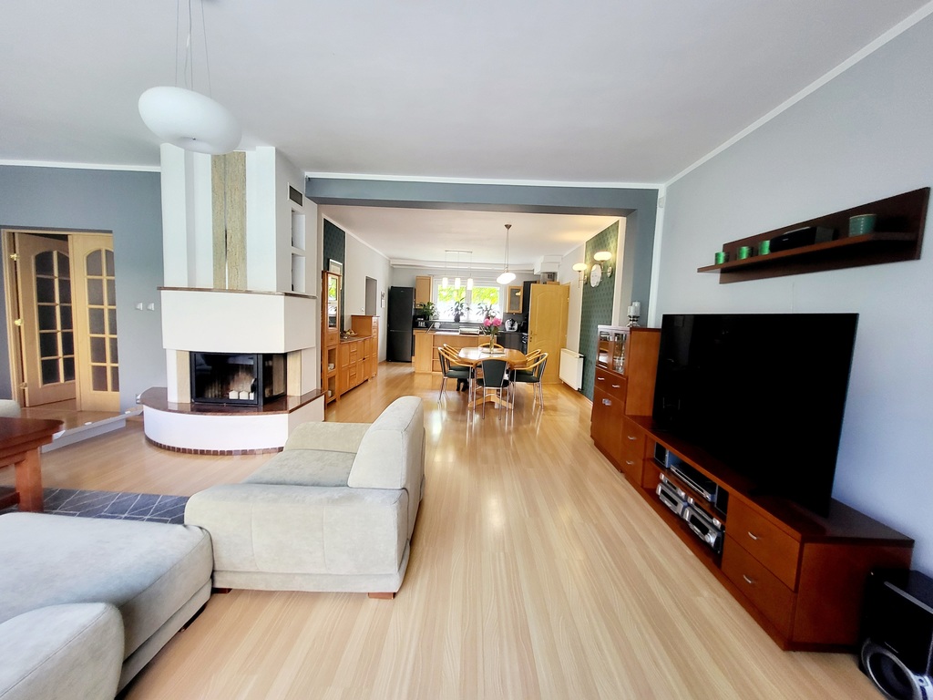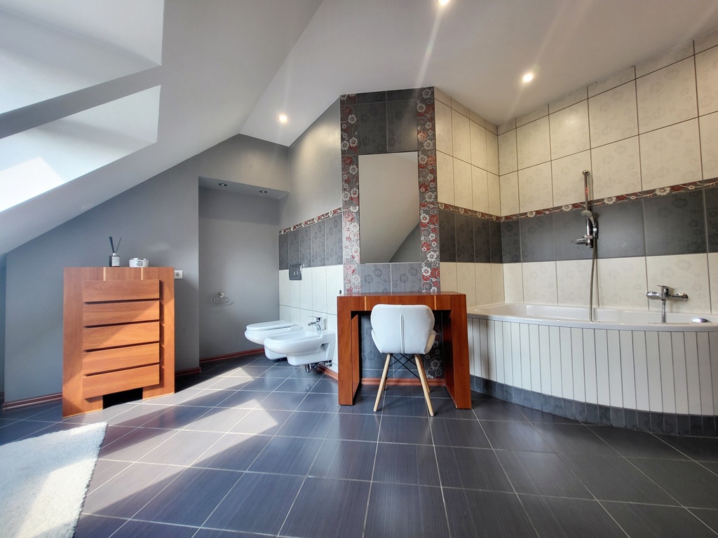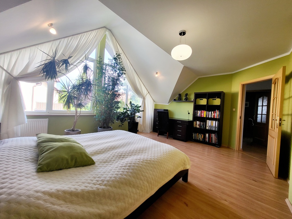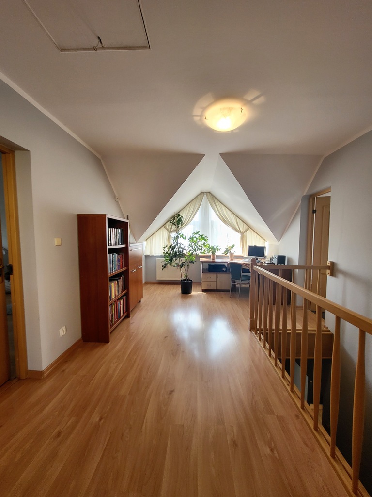 Parter domu składa się na otwartą przestrzeń łączącą ze sobą salon z kominkiem, jadalnię oraz praktyczną kuchnię. Z salonu znajduje się wyjście na zadaszony taras oraz do ogrodu. Na parterze znajduje się dodatkowo sypialnia gościnna oraz łazienka. Schody prowadzą nas na bardziej intymną część domu gdyż na piętrze znajduje się łazienka oraz się trzy przytulne sypialnie - z czego jedna główna z prywatną łazienką i garderobą. Na strychu znajduje się pomieszczenie o powierzchni ok. 70m po podłodze, która jest niewliczona do metrażu użytkowego nieruchomości. Z parteru domu możemy przejść do osobnej części stanowiącej garaż jednostanowiskowy oraz pomieszczenie gospodarcze, w którym znajduje się piec gazowy oraz zasobnik na wodę. Nad całością tej części znajduje się poddasze, które może zostać wykorzystane jako gabinet, pomieszczenie rekreacyjne lub pokój dla nastolatka z łazienką z wanną. Jest tam zainstalowany osobny podlicznik prądu. Do pokoju prowadzi osobna klatka schodowa z odrębnym wejściem do ogrodu.