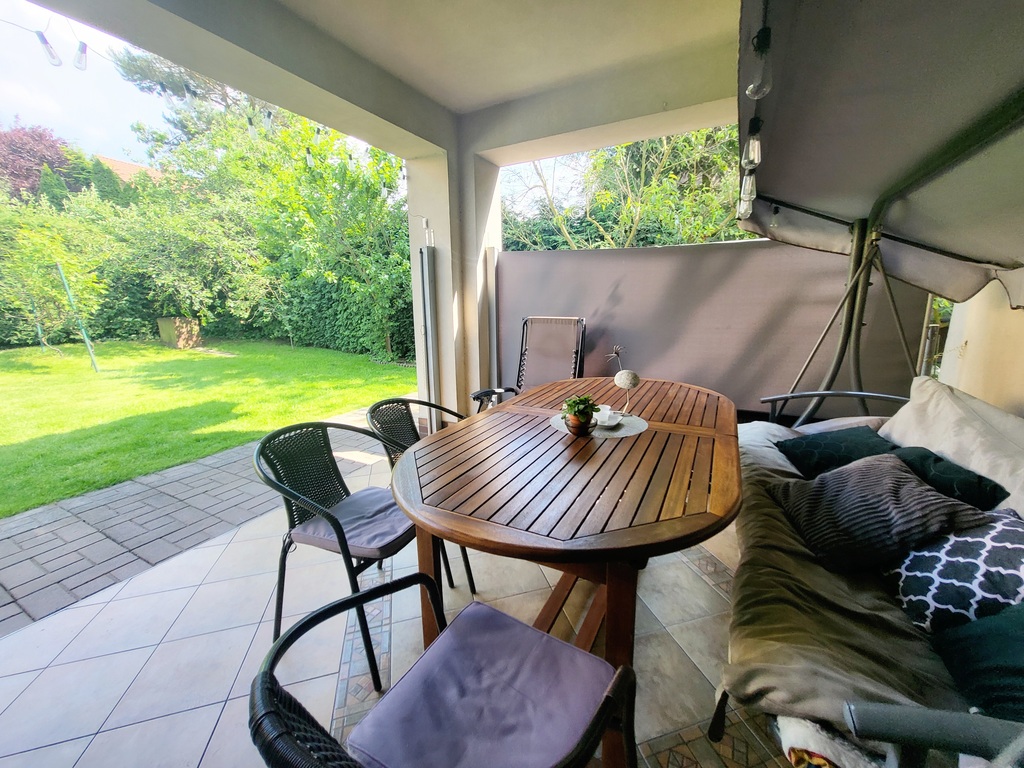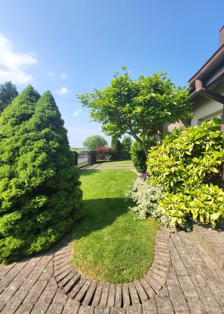 Zagospodarowany ogródek umili spędzanie czasu na świeżym powietrzu. Znajduje się tu gęsty żywopłot, piękna magnolia, ozdobne nasadzenia, zadbany trawnik oraz wybrukowany podjazd i chodniki. Na tyłach domu znajduje się wiata na dwa samochody z boczną bramą. Został zainstalowany osobny licznik na wodę ogrodową. Na działce jest plac pod duży, rozkładany basen o średnicy 6m, który zostaje w wyposażeniu.