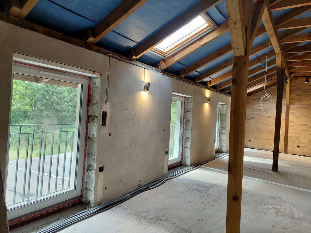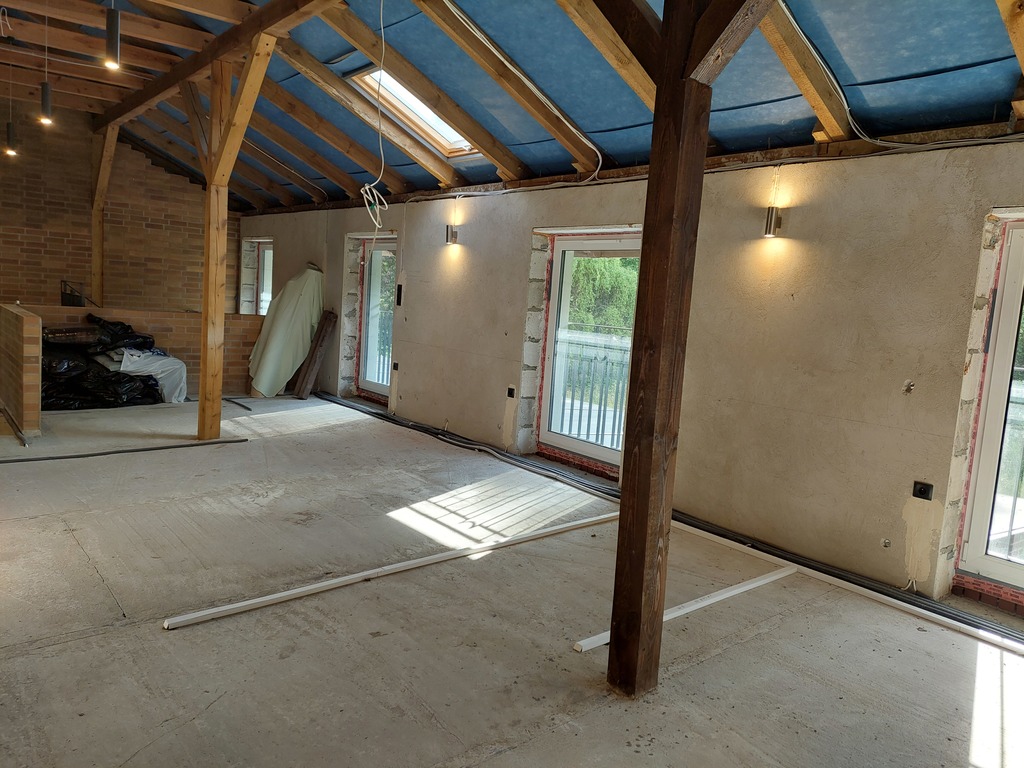 Budynek w trakcie prac wykończeniowych, do indywidualnej aranżacji wnętrza, bez wykonanej instalacji (co i cwu). Z uwagi na obszar działki oraz zaplecze techniczne, duże możliwości rozwiązań instalacji do celów grzewczych i przygotowania ciepłej wody.