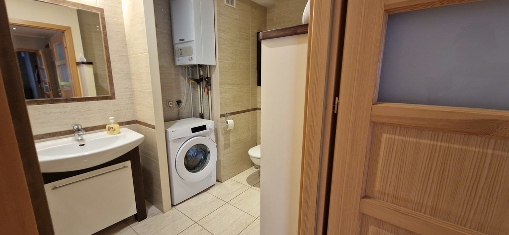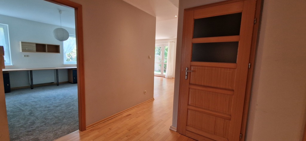 Lokum składa się z trzech pokoi: przestronnego salonu oraz dwóch sypialni. Kuchnia jest w pełni umeblowana w zabudowie i wyposażona w sprzęty AGD, a łazienka kompletna , z wanną i pralką. Dodatkowym atutem lokalu jest ogród, taras oraz szopa narzędziowa. Niedawno wykonano lekkie odświeżenie – wymieniono wykładziny w pokojach oraz odmalowano ściany, a także będzie dołożona część nowych mebli.