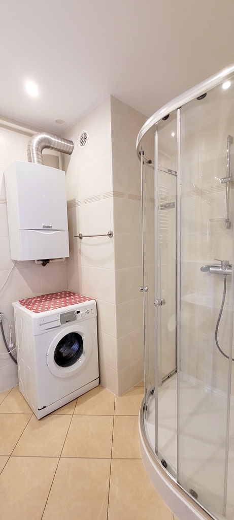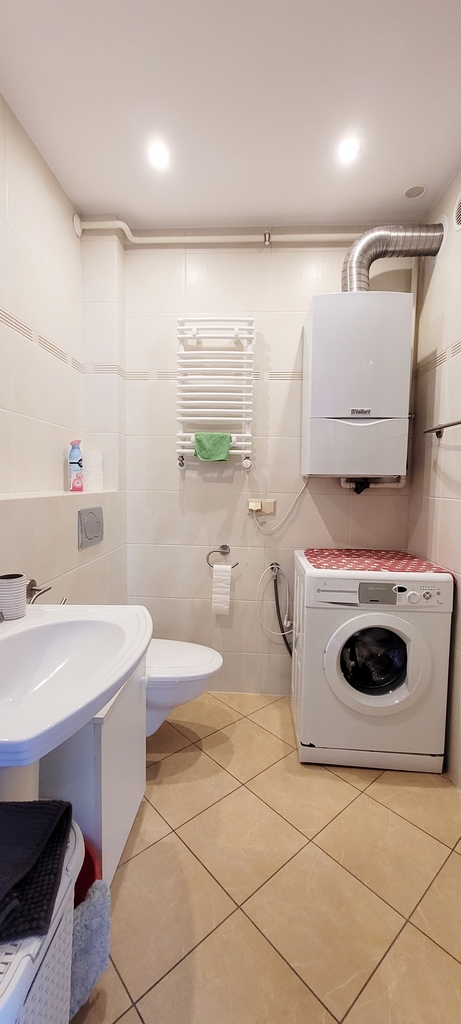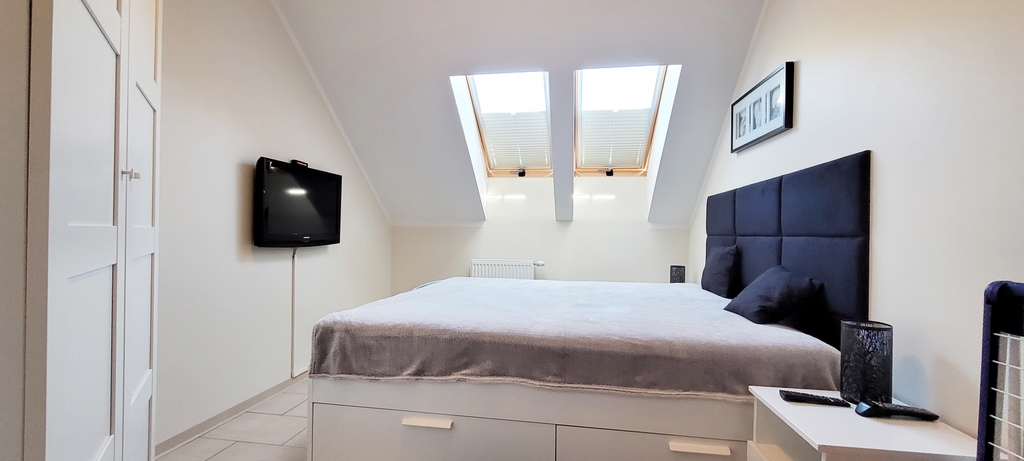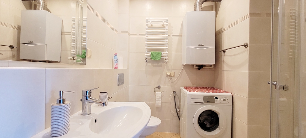 Składa się z pokoju dziennego z aneksem kuchennym, sypialni, łazienki. Z pokoju dziennego jest wyjście na przestronny, słoneczny balkon. Powierzchnia użytkowa mieszkania ok. 40m2. Ogrzewanie i gorącą wodę zapewnia dwuobiegowy piec gazowy.