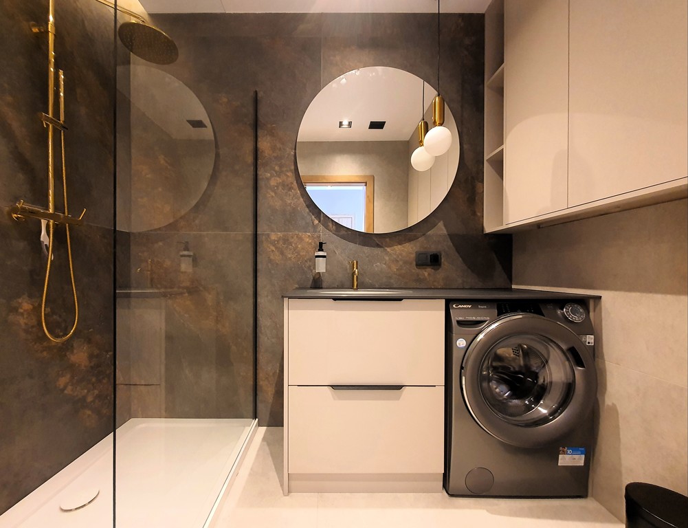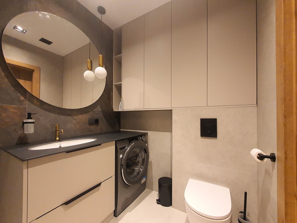 - łazienki (4,5 mkw) w wysokim standardzie wyposażonej w przestronną kabinę prysznicową typu walk-in, wc podtynkowe, umywalkę zintegrowaną z blatem oraz szafki i duże lustro. Armatura wysokiej jakości, urozmaicone niezależne oświetlenie, pralka…