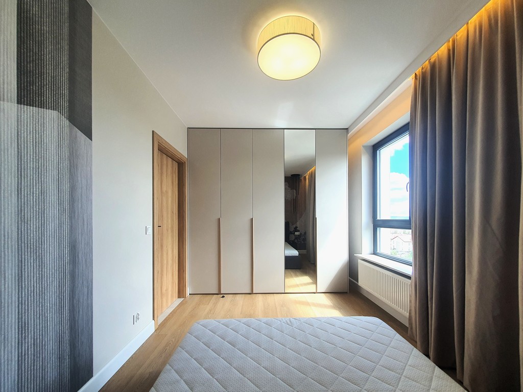 - sypialni (12 mkw) wyposażonej w duże łóżko małżeńskie oraz bardzo przestronną szafę w zabudowie na wymiar