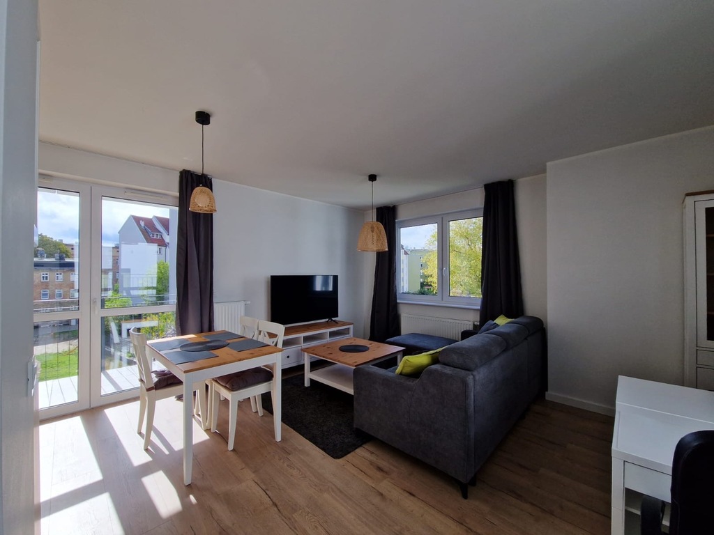 Lokum składa się z 3 pokoi: przestronnego salonu, połączonego z aneksem kuchennym, oraz dwóch sypialni. Kuchnia jest w pełni umeblowana w zabudowie i wyposażona w wszelkie sprzęty AGD. Łazienka jest doposażona w pralkę oraz prysznic. Dodatkowym atutem są 2 balkony oraz możliwość wynajęcia miejsca parkingowego w garażu podziemnym za 600zł miesięcznie.
