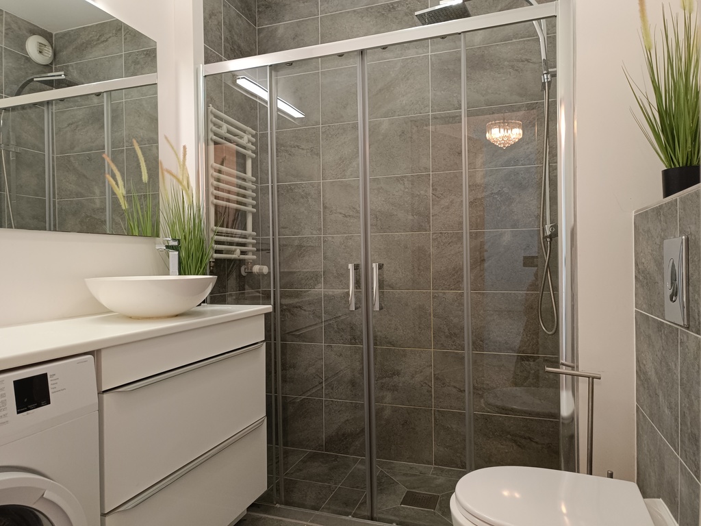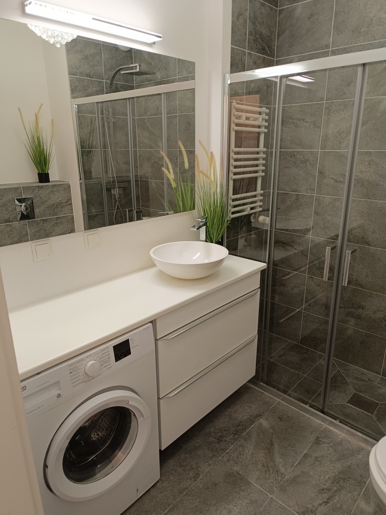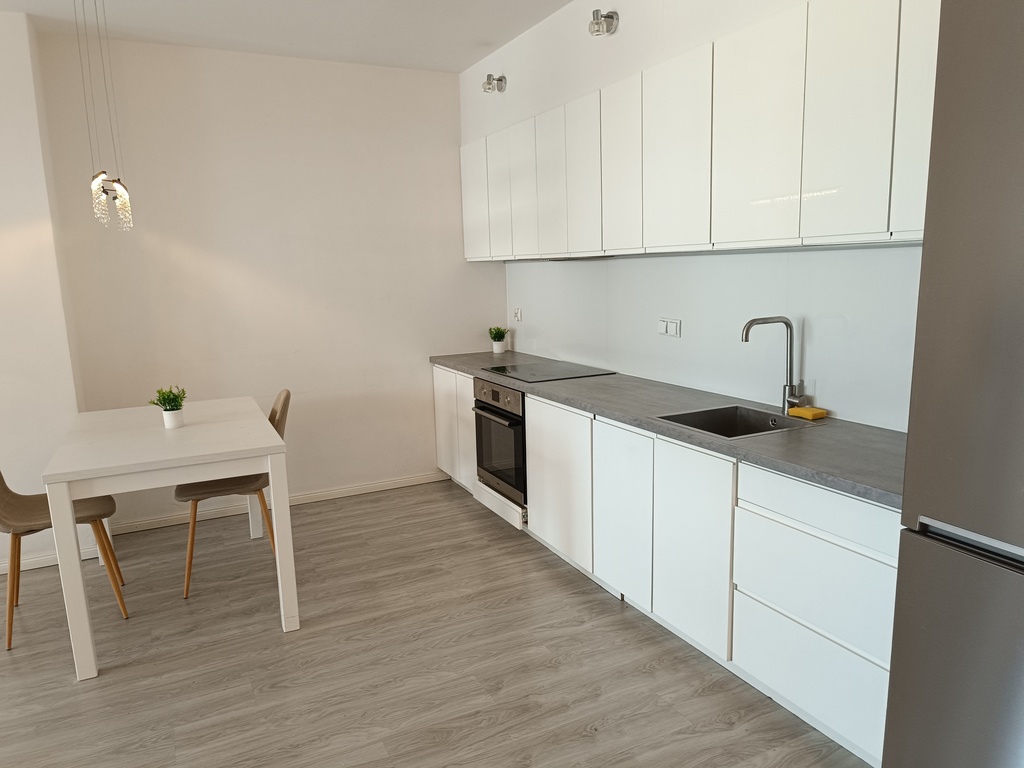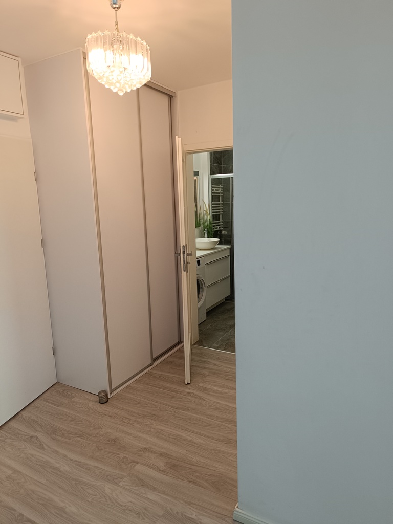 W kuchni jest zabudowa kuchenna i sprzęt AGD: zmywarka, piekarnik, lodówka z zamrażarką. Łazienka z prysznicem, pralka. W przedpokoju i sypialni - zabudowana szafa. Do mieszkania przynależy piwnica o powierzchni 4,05 m2.