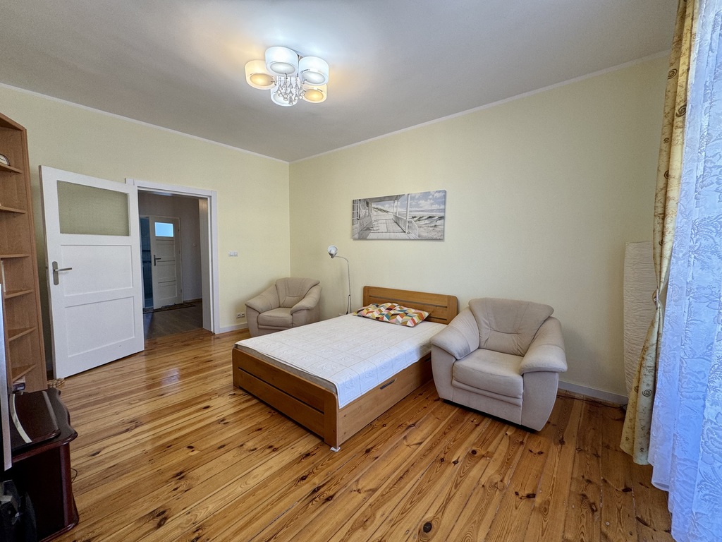 W pokojach na podłogach pięknie zachowana oryginalna deska sosnowa, w przedpokoju panele (pod panelami deski). Oryginalna stolarka drzwiowa. Mieszkanie zostało wyremontowane na przestrzeni ostatnich kilku lat.
