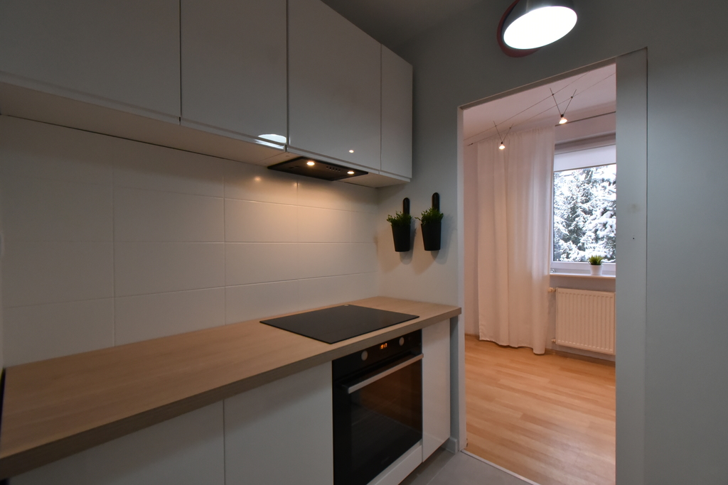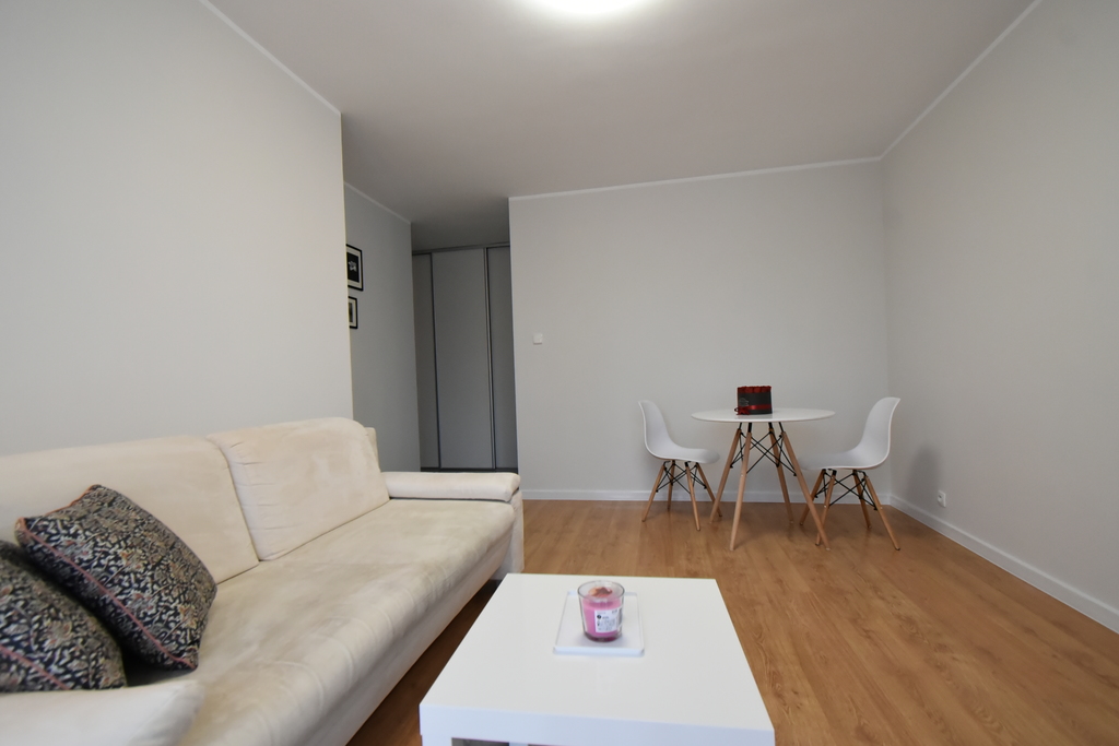Salon przestronny i słoneczny, do użytku kanapa, komoda pod TV, stolik oraz stół jadalniany z krzesłami. Kuchnia wraz ze sprzętem AGD typu: płyta elektryczna, piekarnik, okap, lodówka oraz zlewozmywak. Łazienka wyposażona w wannę, WC, umywalkę oraz pralkę. W przedpokoju duża szafa typu Komandor.