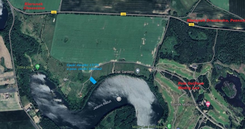 Działka budowlana zlokalizowana w malowniczym miejscu z linią brzegową przy pięknym i czystym jeziorze Raduń. Jezioro znajduje się przy miejscowości Choszczno posiadającą pełną infrastrukturę sklepów, szpitali, rehabilitacji kina itd, przy trasie kolejowej Szczecin-Warszawa. Przy działce znajduje się jedno z najlepszych pól golfowych w Polsce "Modry Las" (Modrylas pl).