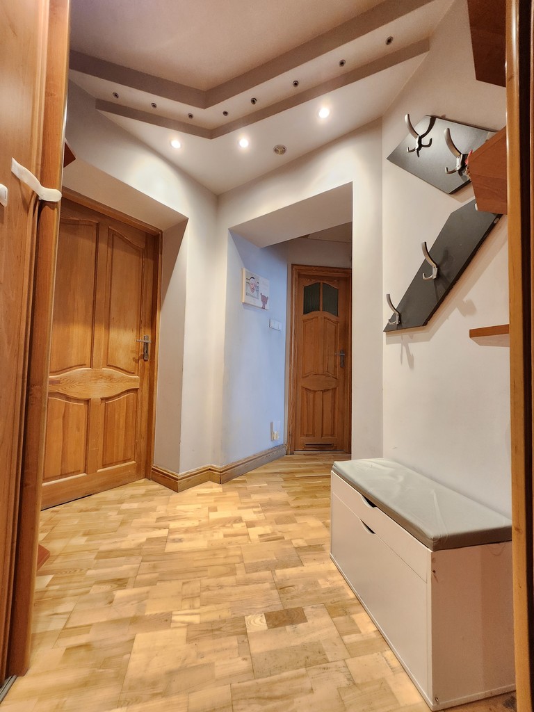 Kuchnia wyposażona w meble w zabudowie oraz sprzęt AGD. Łazienka z kabiną prysznicową wykończona gustownymi kaflami. Korytarz z szafami w zabudowie oraz pawlaczem.