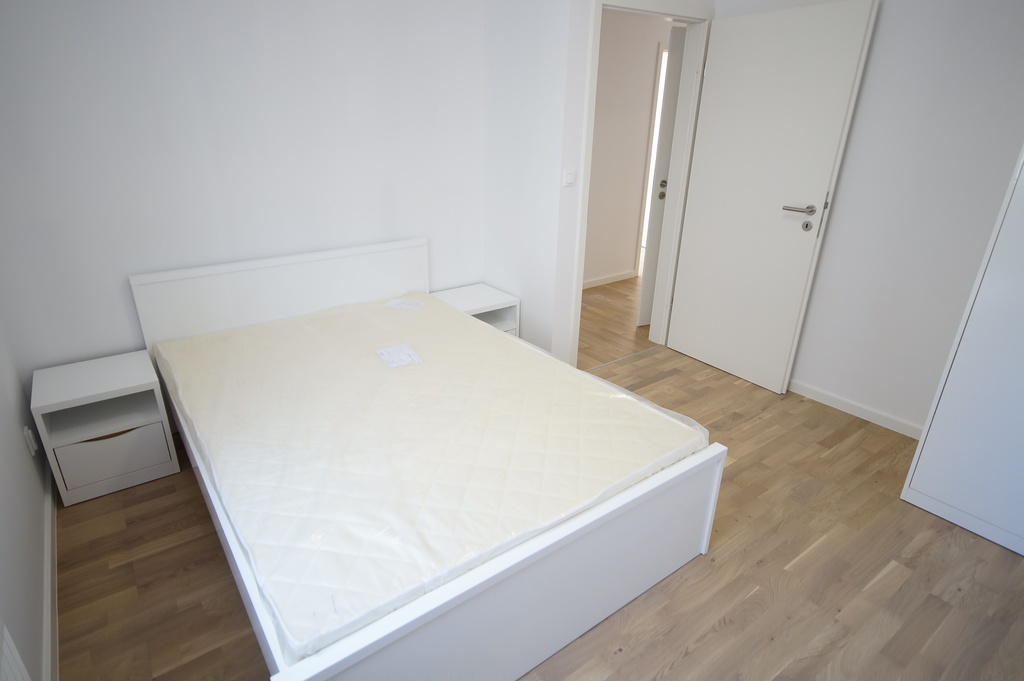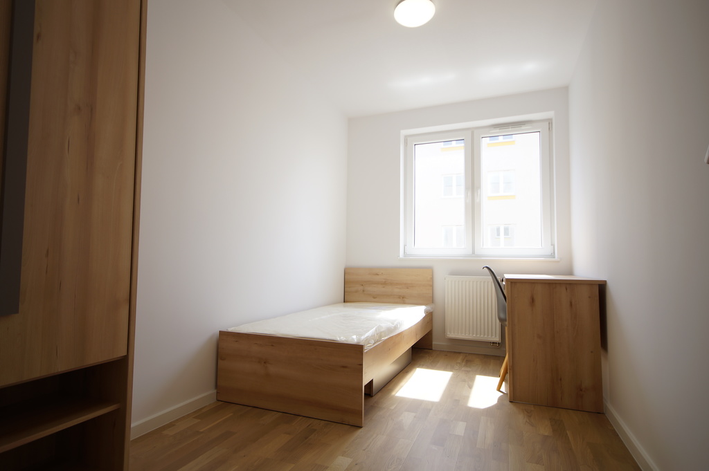 - Pokój 1 - o pow. ok. 12 m2 uposażony w nowe meble - szafę, łóżko, oraz biurko, na podłodze parkiet, ściany gładzone pomalowane.