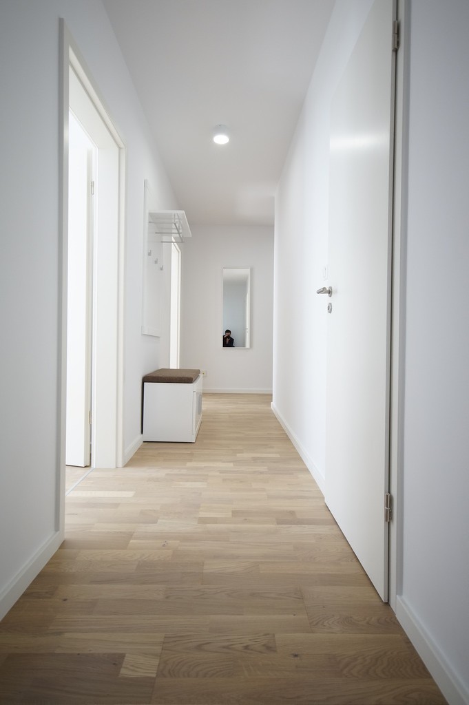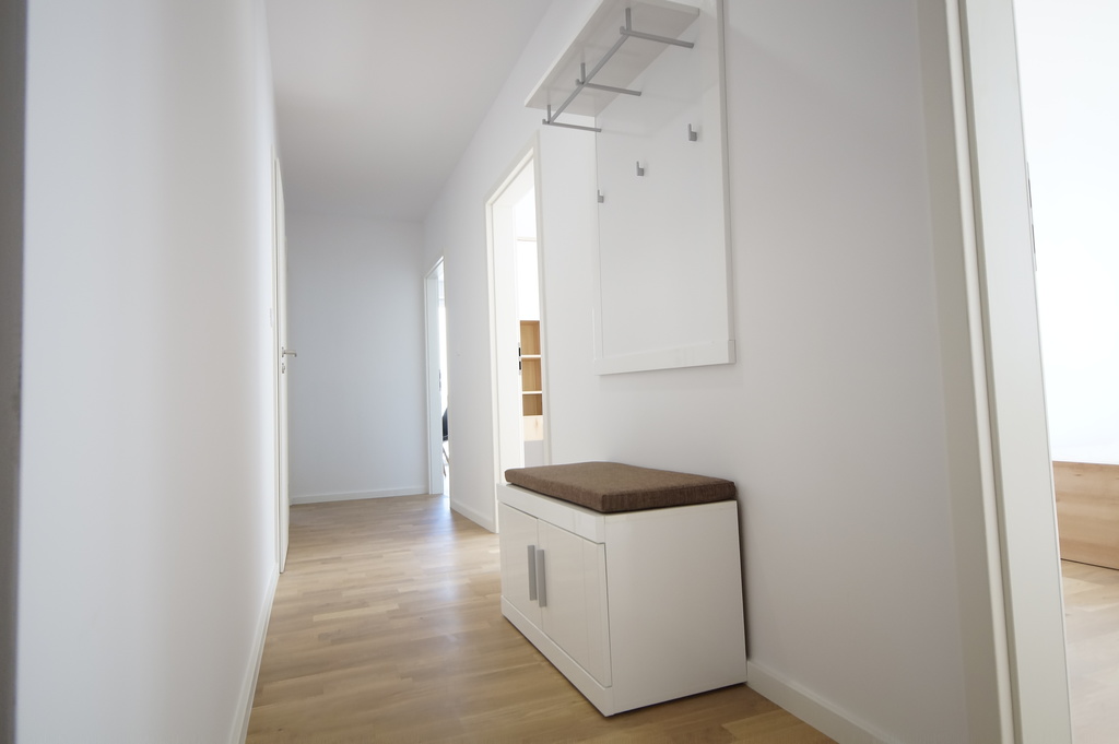 - Przedpokój ok. 8 m2 na środku znajduję się wieszaka na ubrania oraz szafka na obuwie, na podłodze parkiet, ściany gładzone pomalowane.