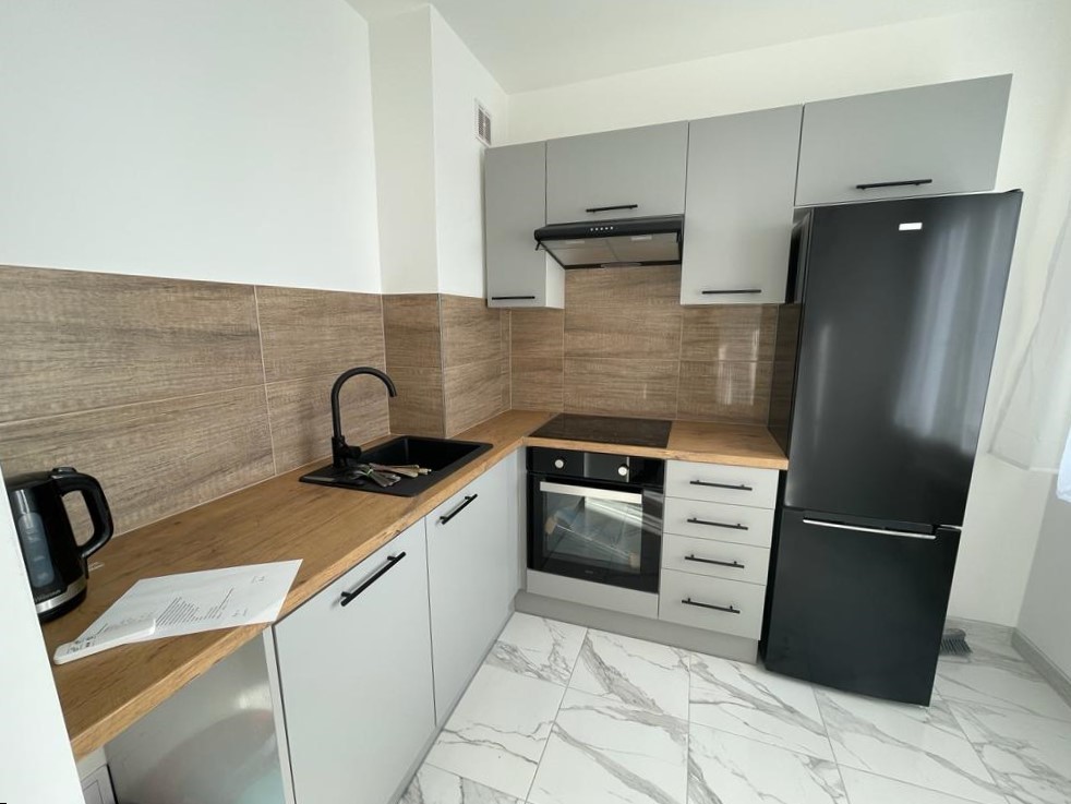 * widna kuchnia wyposażona w sprzęt AGD (lodówka, zmywarka, kuchenka);