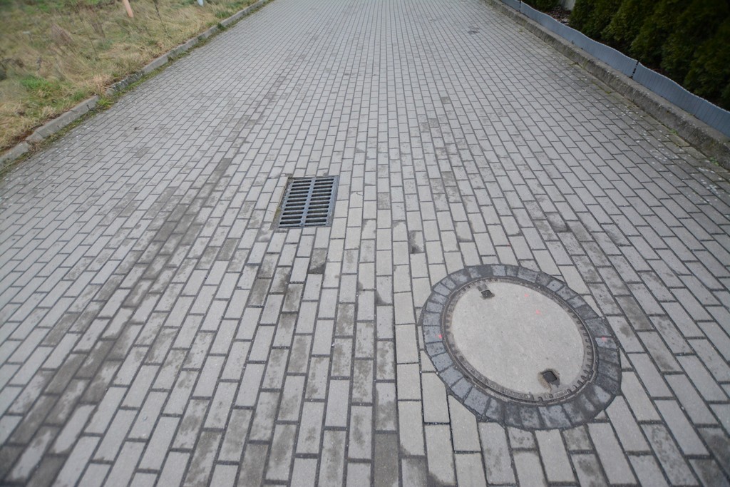 Droga wewnętrzna polbrukowa, oświetlona z rozprowadzoną instalacją kanalizacji deszczowej.