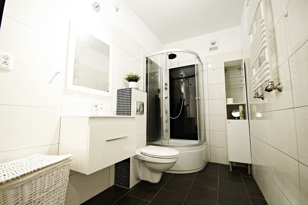 - Łazienka ok. 4 m2 z kabiną prysznicową, umywalką oraz WC w glazurze i terakocie.