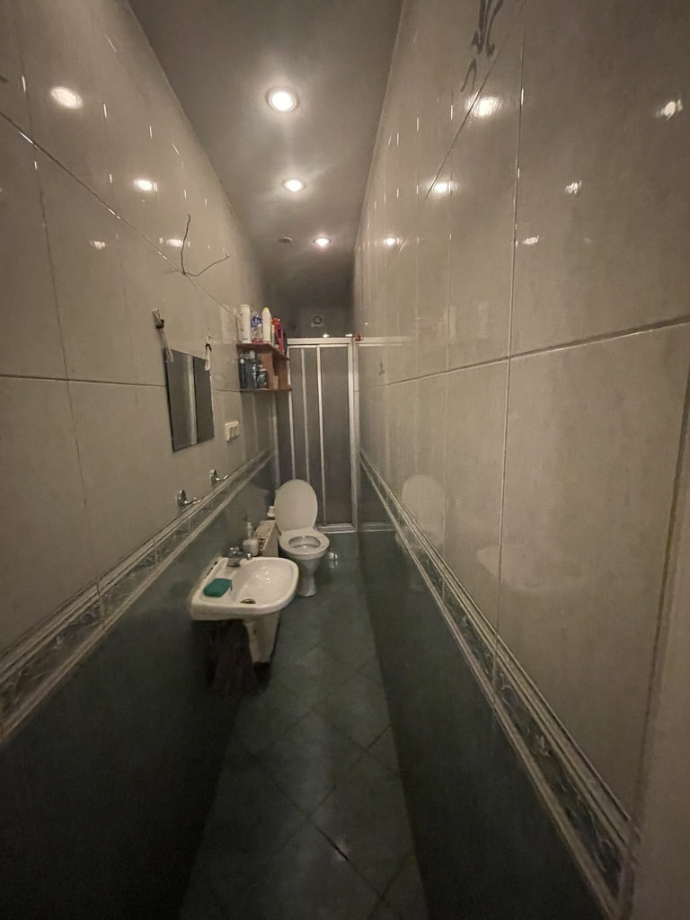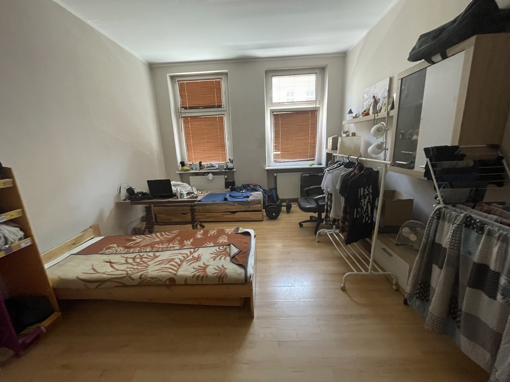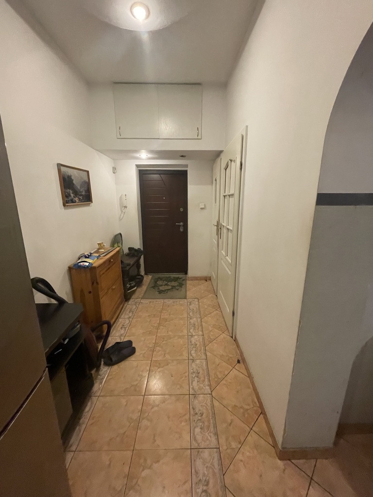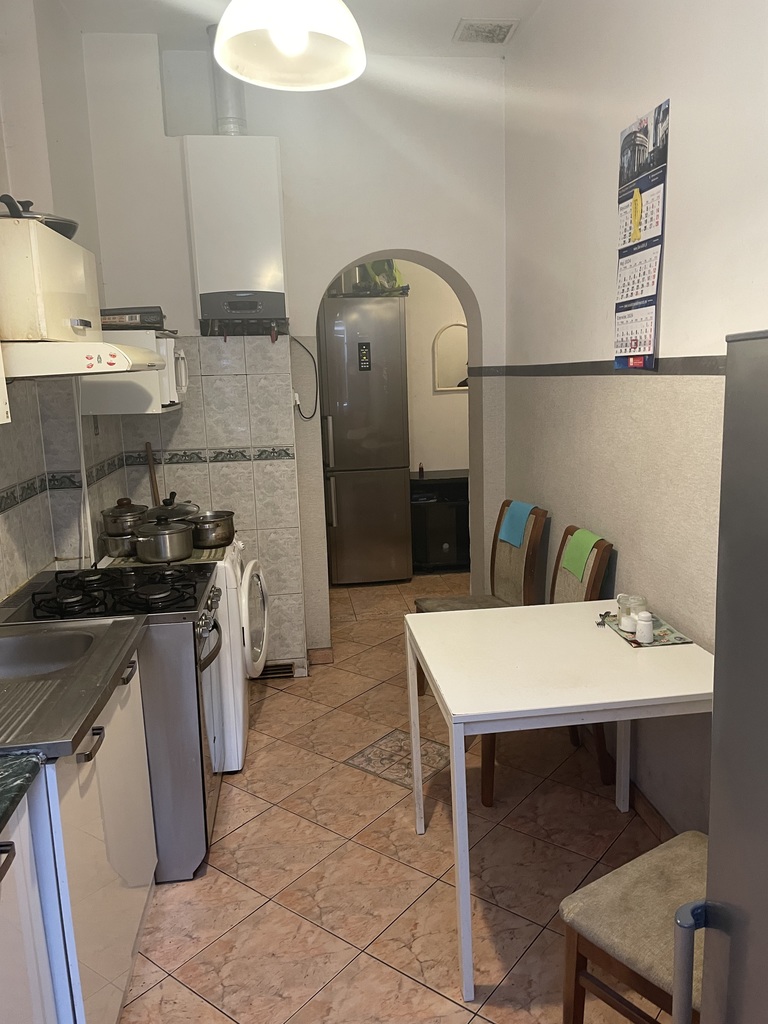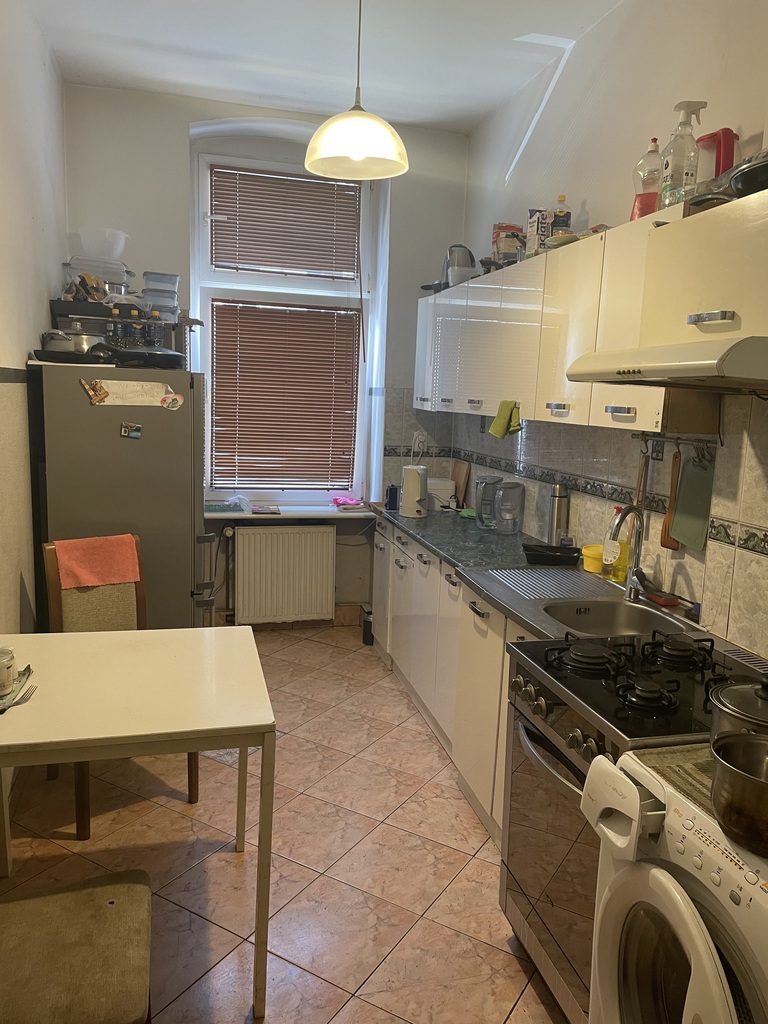Dwa duże pokoje (jeden od ulicy, drugi od podwórka), duża kuchnia z oknem, mniejsza sypialnia i mała wąska łazienka z prysznicem.