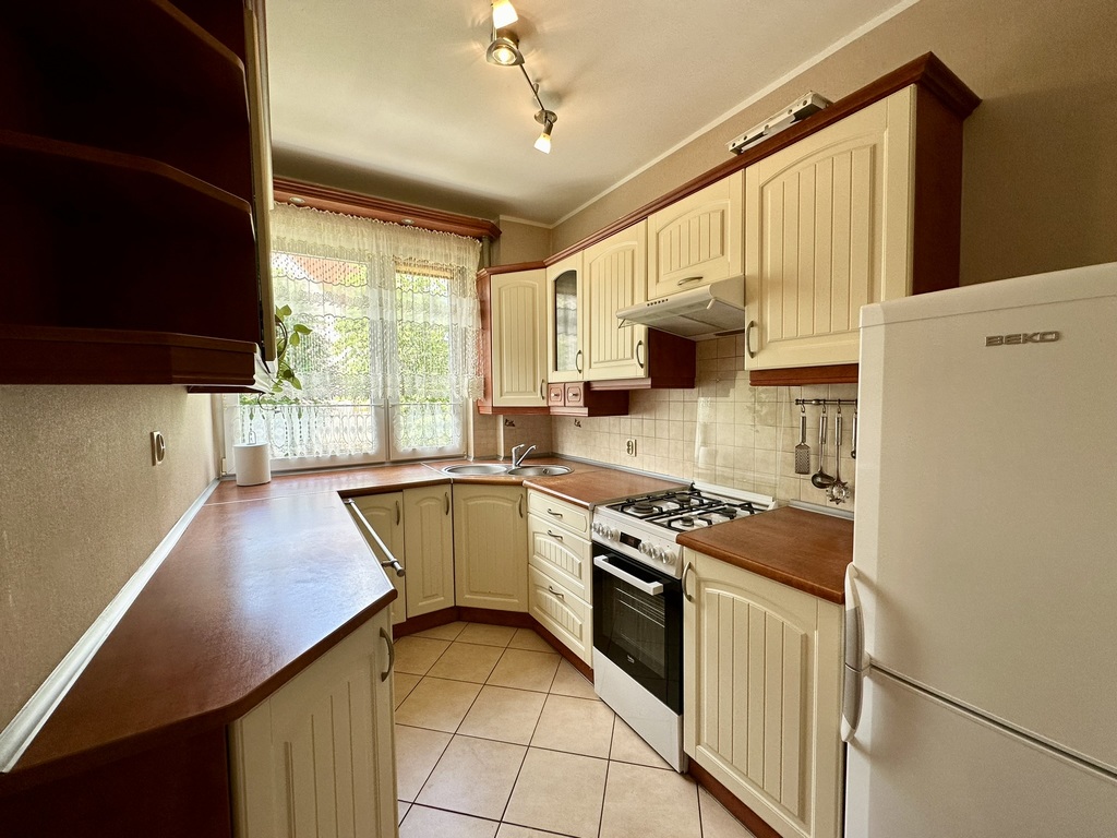 Kuchnia wyposażona w meble w zabudowie, zlewozmywak, kuchenkę gazowa, piekarnik, lodówka oraz okap. W łazience wanna, umywalka. Osobno WC. Ściany w pokojach pomalowane w jasnych barwach. W pokojach na podłodze zostały położone panele, natomiast w innych pomieszczeniach terakota. Drzwi wejściowe antywłamaniowe, okna PCV.