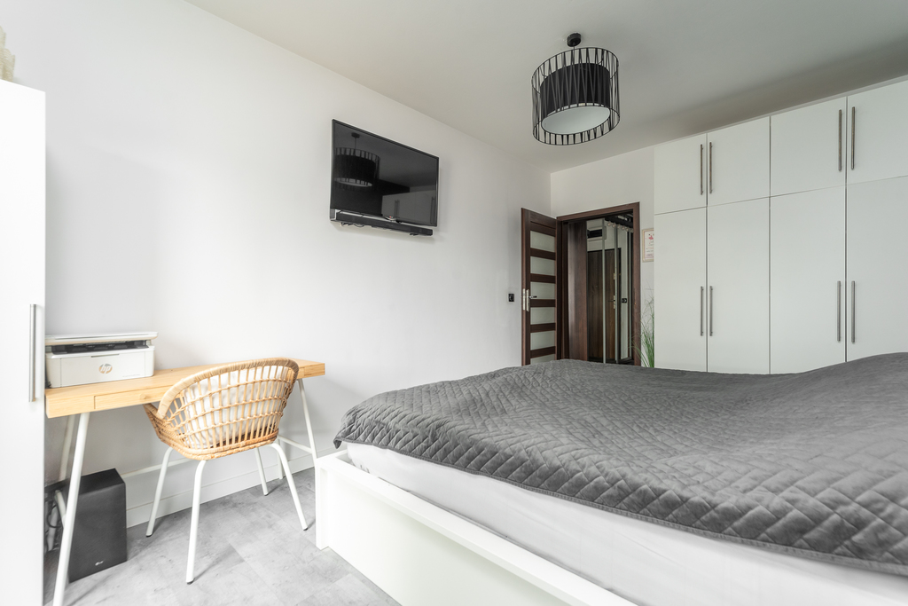 Mieszkanie jest wykończone  wysokiej jakości materiałami, zabudowa w sypialni i przedpokoju szafami typu Komandor, zabudowa kuchenna meblami na wymiar z pełnym sprzętem AGD renomowanych firm.