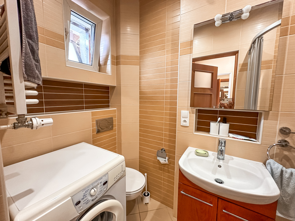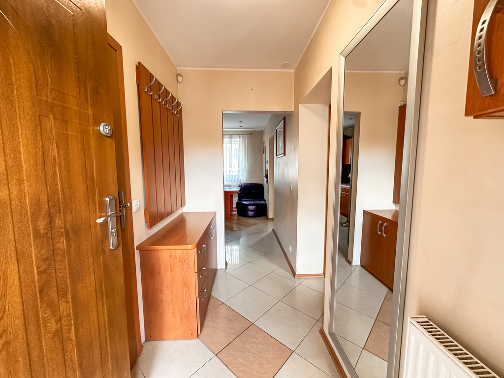 Mieszkanie składa się z dwóch sypialni, łazienki oraz oddzielnej kuchni z jadalnią i oknem. Kuchnia połączona z salonem jest przestronna, ma aż 27 m2 i jest bardzo jasna. W sypialniach znajdują się szafy w zabudowie, co zapewnia bardzo dużo miejsca do przechowywania.