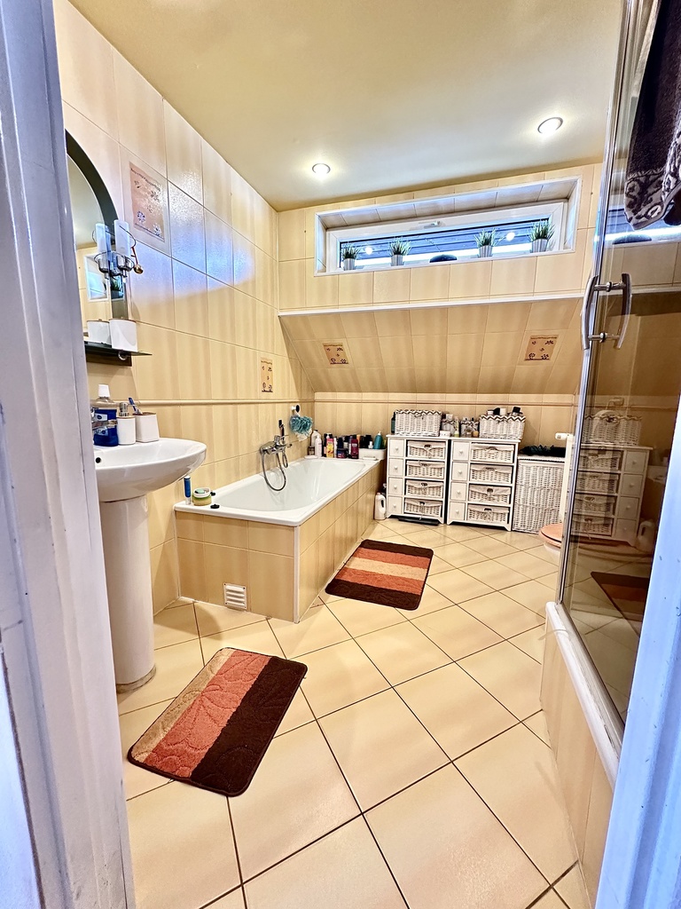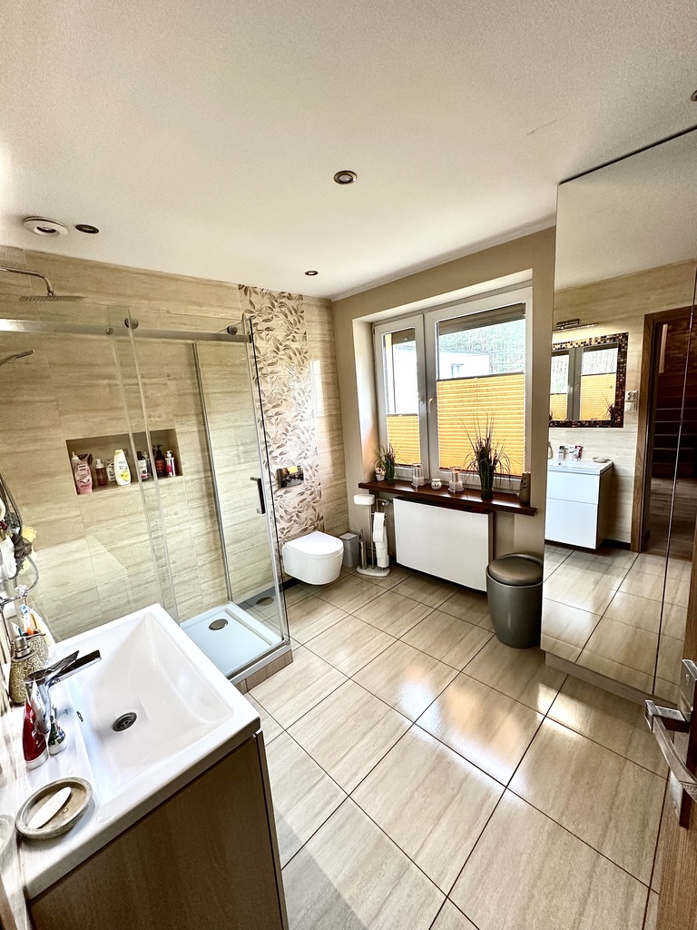 - Łazienka z prysznicem i wanną oraz oknem, o powierzchni ok. 7 m2.