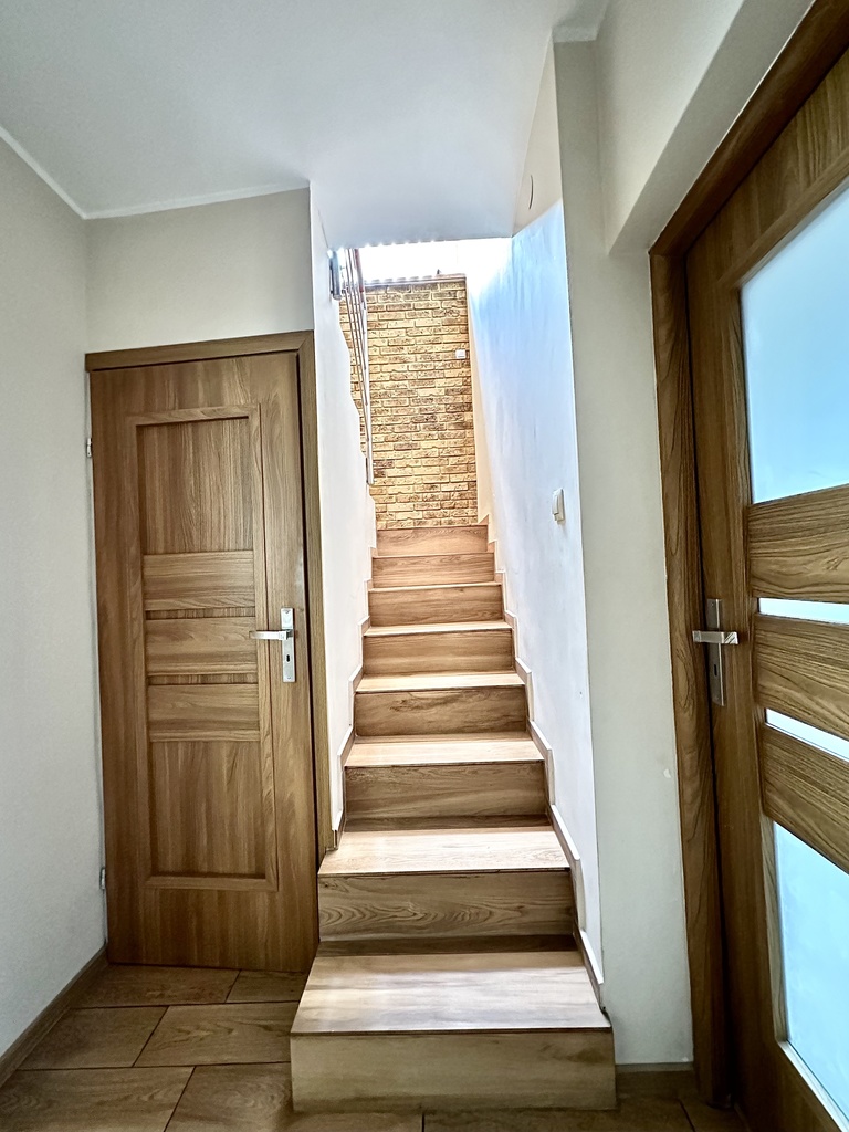 Schody prowadzące na piętro są obłożone terakotą o wyglądzie drewna, wykonane z lanego betonu, co zapewnia trwałość i estetyczny wygląd. Okna w całym domu są plastikowe, dwuszybowe, zapewniając dobrą izolację termiczną. W aneksie kuchennym znajdują się okna dwuszybowe firmy M&S ze Słupska.