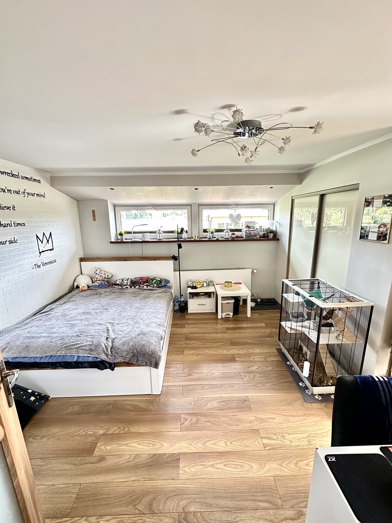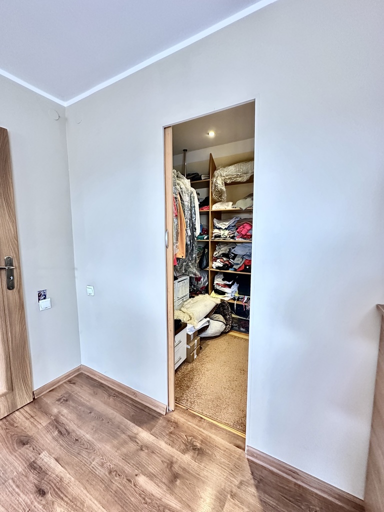- Sypialnia z garderobą, o powierzchni ok. 22 m2, zapewniająca komfort i dużo miejsca na przechowywanie,