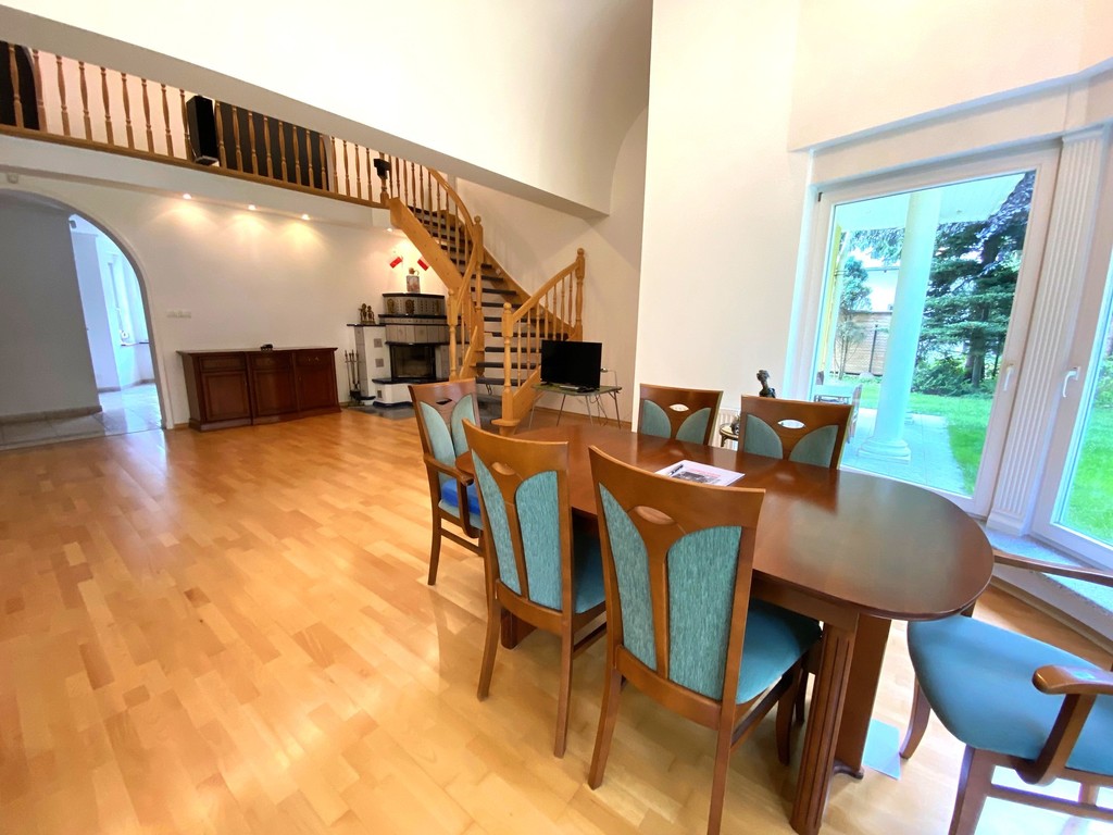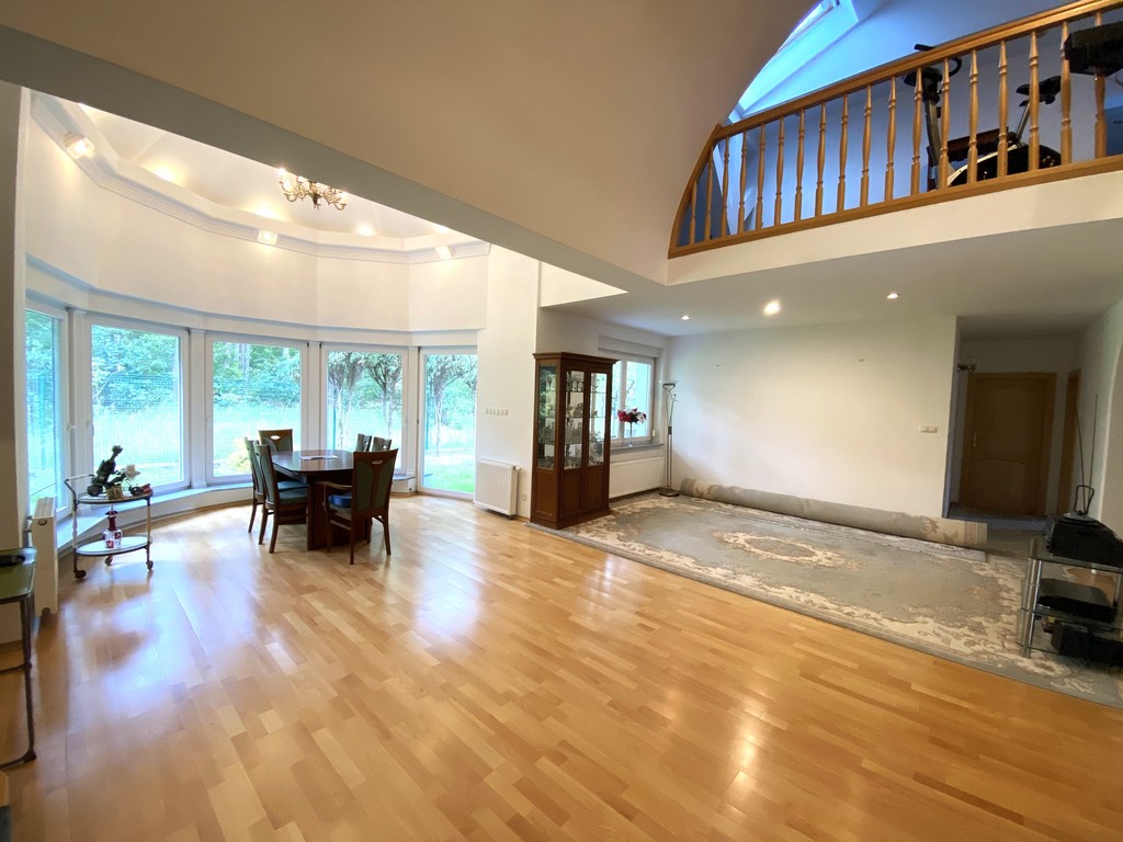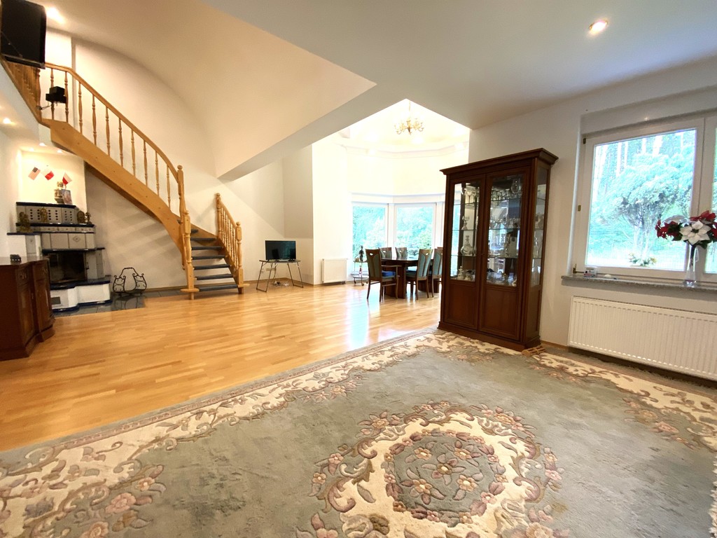 * Otwarty salon z kominkiem o powierzchni ponad 42 m2, witryny tarasowe z widokiem na ścianę lasu