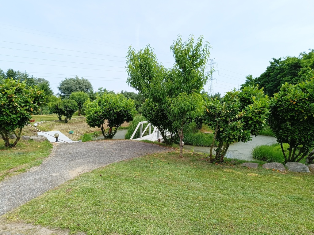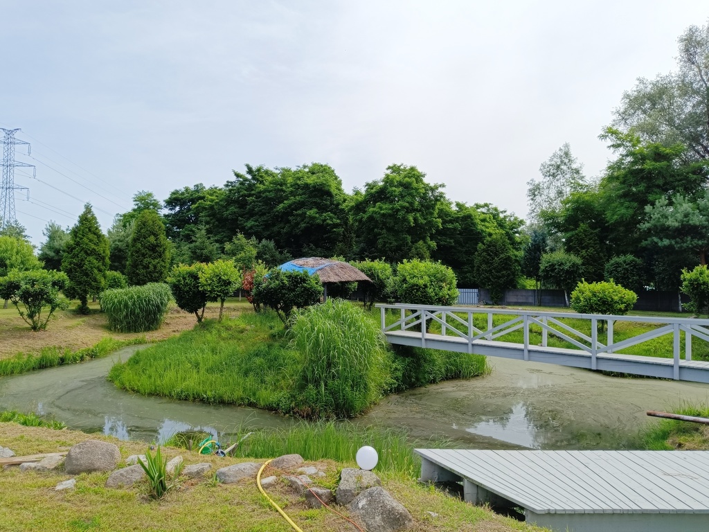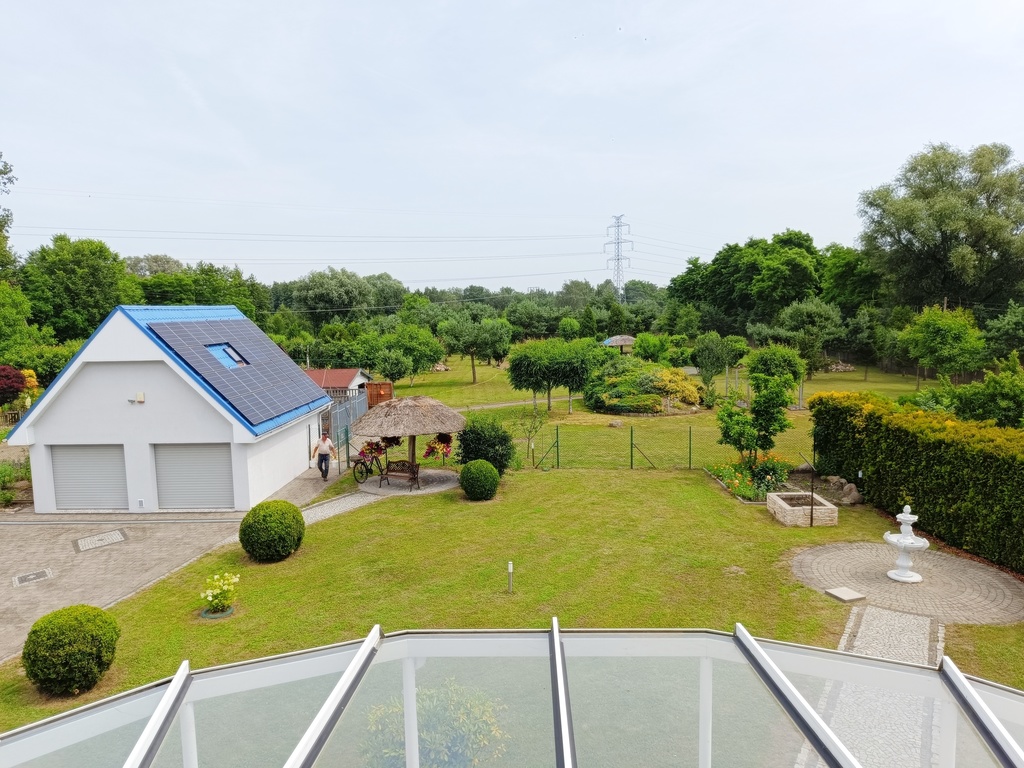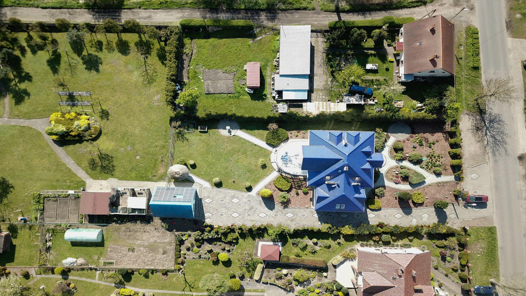 Działka o łącznej powierzchni 5570 m2 to tak naprawdę przepięknie urządzony ogród. Z tarasu roztacza się widok na cały otaczający nas zielony teren. Na działce między innymi miejsca do wypoczynku, ławki, fontanna, staw, mostek, altana (12 m2), mała winnica, liczne drzewa i krzewy (brzozy, sosny, rododendrony, orzechy włoskie, brzoskwinie, jabłonie, wiśnie, morele, maliny, jeżyny).